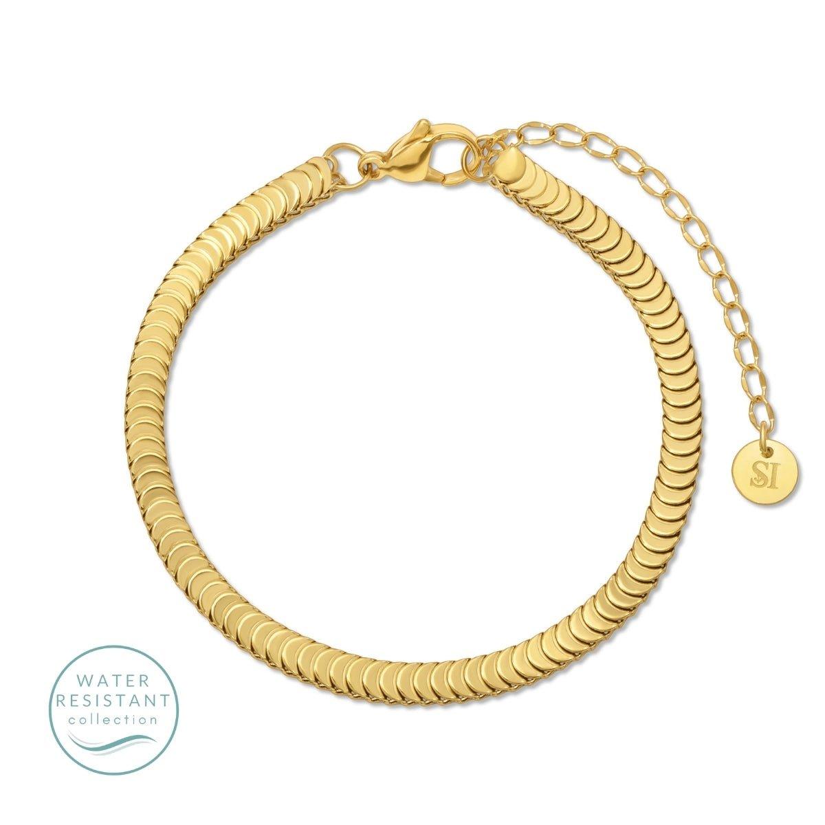 The Many Moons Chain Bracelet features a sleek, high-shine design finished in 18k gold plating. Crafted to be water resistant and durable, this modern chain bracelet is made for everyday wear without compromising style. Wear it alone for a statement look or layer it effortlessly with your favorite bracelets for a timeless, elevated finish.