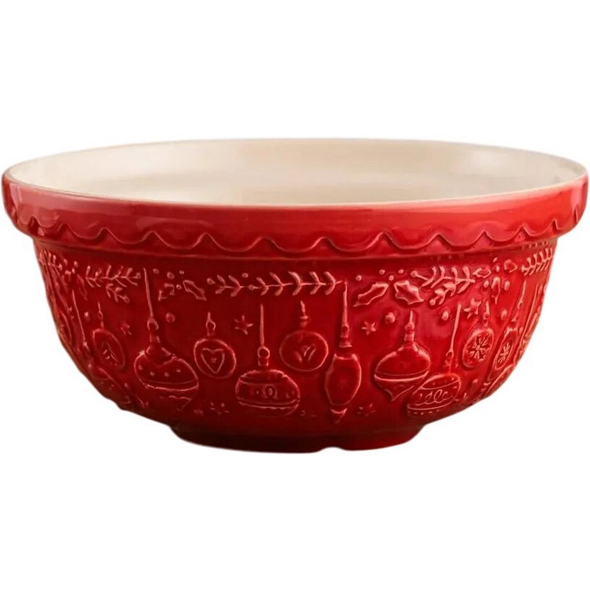 The Mason Cash Limited Edition Deck The Halls S30 Bowl features a unique patterned exterior and rim that provides a secure grip for bakers when tipping the bowl. Its wide, shallow shape allows for easy kneading within the bowl. This Size 30 Mixing bowl measures 8-1/4” in diameter and 4" in height, with a capacity of 1.25-quart (40 fl oz), making it ideal for dough, pumpkin bread, pastry, cake, or cookie mixes. The bowl is safe for use in the dishwasher and freezer.