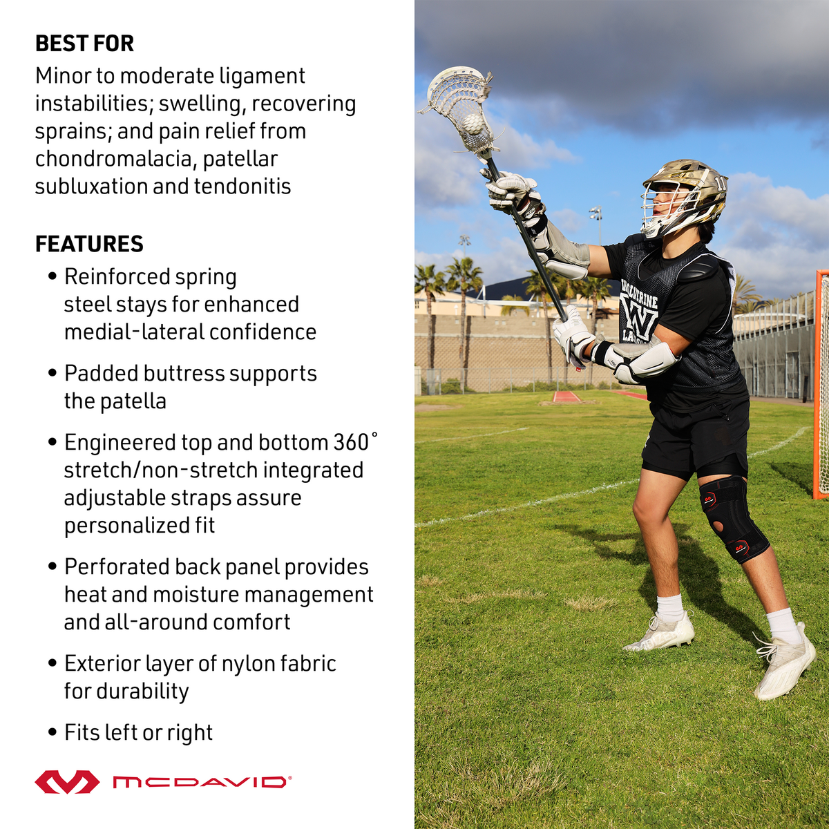 The McDavid Knee Support with Stays is a comfortable, easily customizable knee brace that supports knee healing, pain relief and recovery from chondromalacia, patellar subluxation and tendonitis.