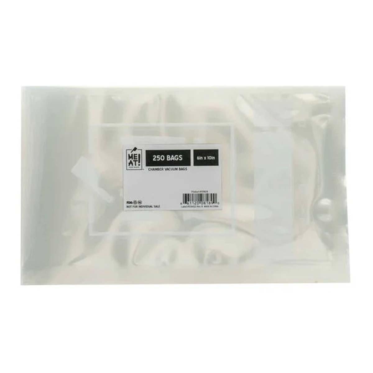 {"reviews":[],"offset":0,"limit":10,"total":0}"Full Description:\nThe MEAT! Chamber Vacuum Sealer bags include 250 bags and are available in widths of 6", 8" or 10". Designed for commercial-grade chamber vacuum sealers, the MEAT! vacuum sealer bags extend freezer life up to 5x longer and prevent freezer burn.\n\nFeatures:\n\u003cul>\n\u003cli>250 Pack\u003c/li>\n\u003cli>Heavy duty plastic\u003c/li>\n\u003cli>Clear\u003c/li>\n\u003cli>BPA Free\u003c/li>\n\u003c/ul>\n\nSpecifications:\n\u003cul>\n\u003cli>Width: 6"\u003c/li>\n\u003cli>Height: 10"\u003c/li>\n\u003cli>3 MIL Thickness\u003c/li>\n\u003c/ul>\n"