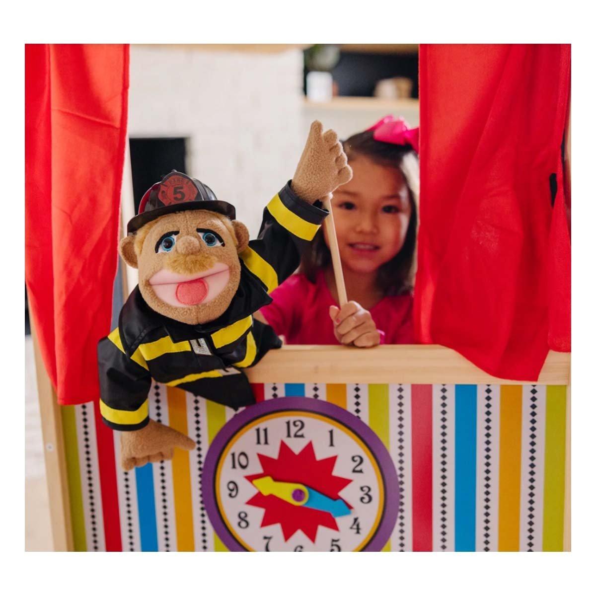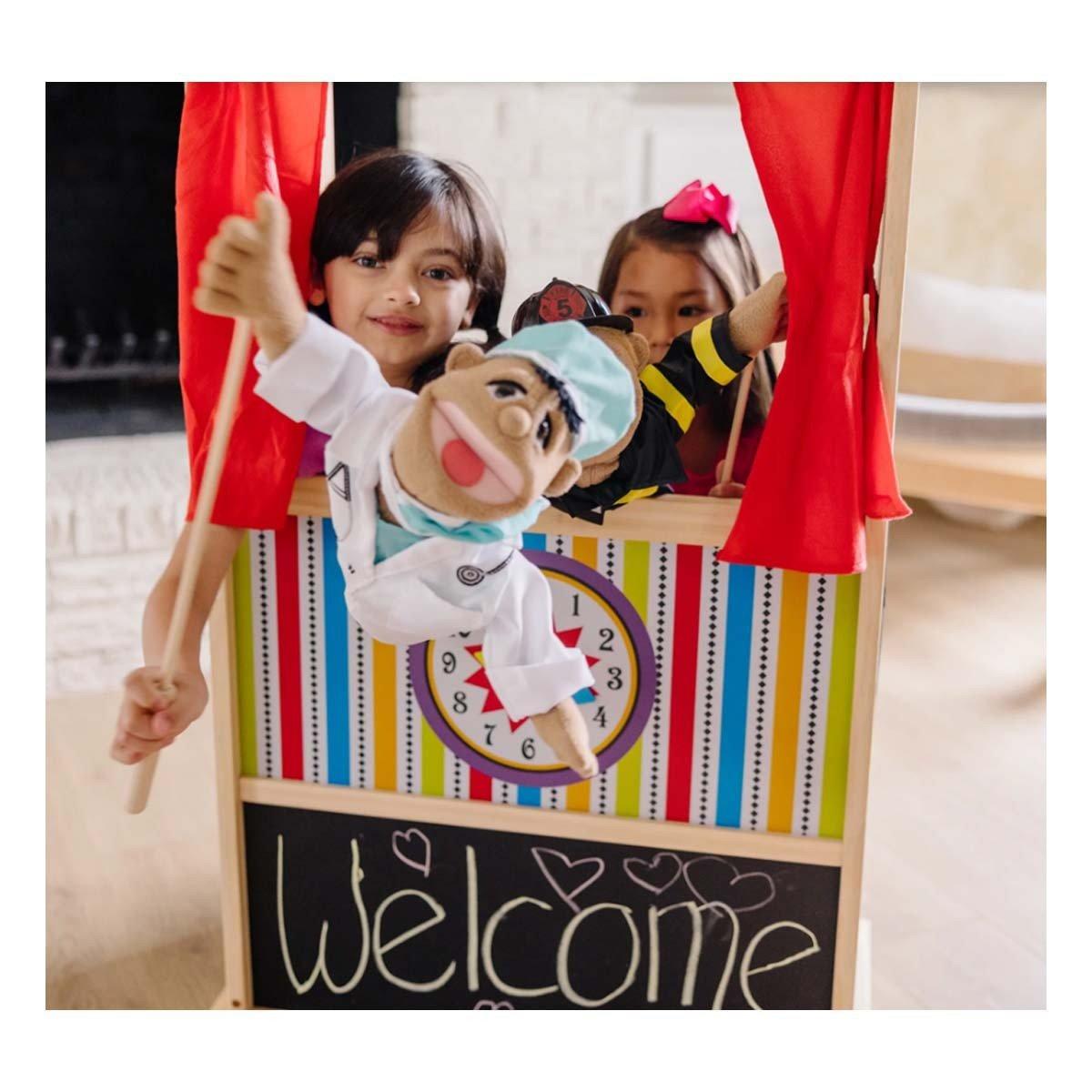 It's show time! This wooden puppet theater has been designed with a sturdy, non-tip base and plenty of room inside for a puppeteer or two! The stylized theatrical graphics and plush, velvety curtains will inspire creativity and expression in any child. Including a clock with movable hands and a chalkboard panel for playbill information, it's a stage just awaiting imagination!