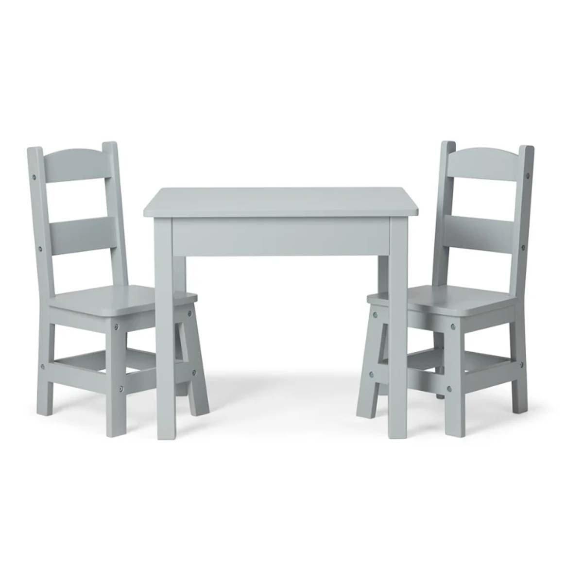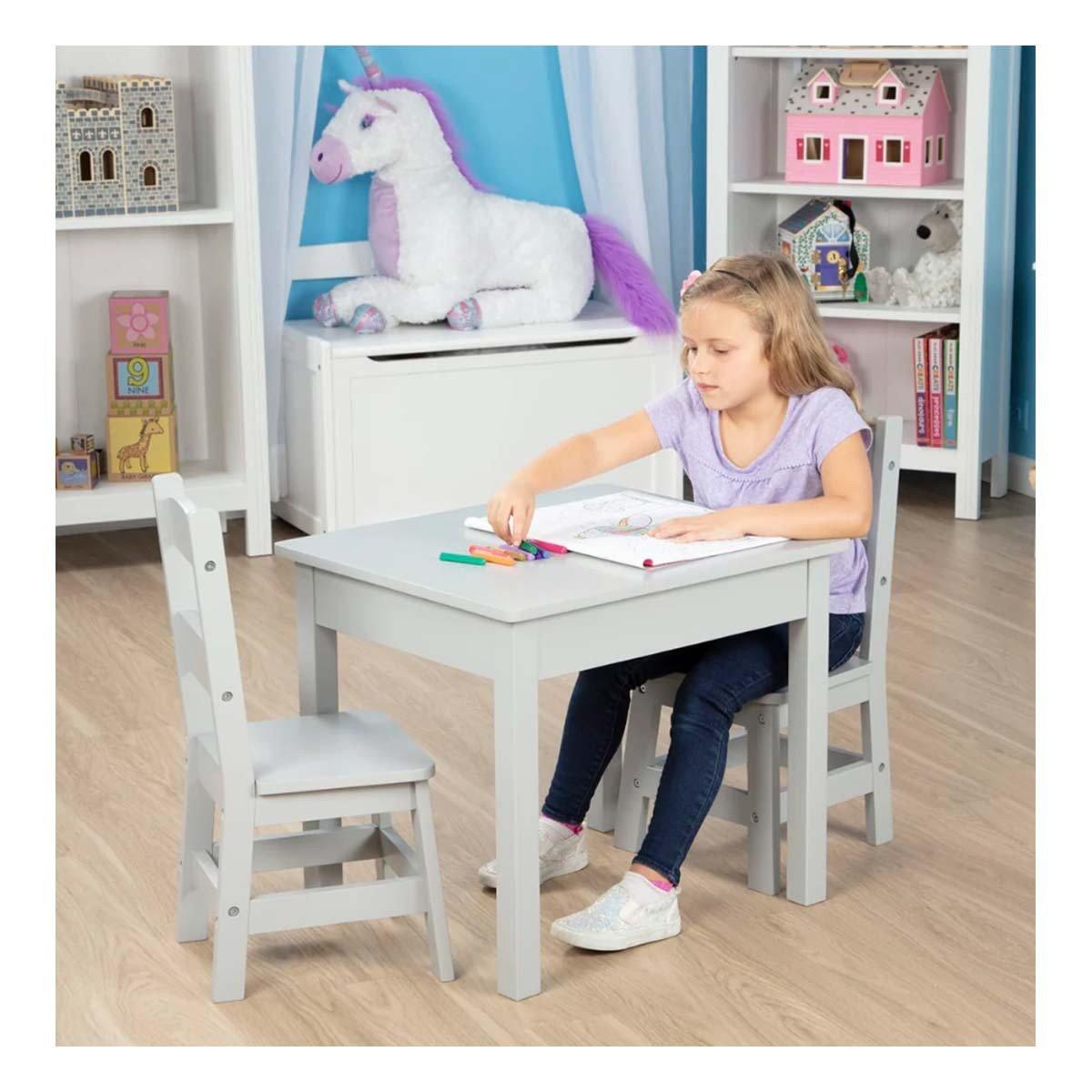 This set of two chairs and a sturdy wooden table is sized just right for kids three to eight years old and holds up to 100 pounds! The table and chairs have a light gray finish to fit with any home décor, and wipe down easily to stay looking crisp and clean. Top the table with a child’s favorite puzzles and games or use it for arts and crafts, tea parties, lunch and snacks, and so much more! The table and chairs are simple to construct with just a Phillips-head screwdriver (not included), and incredibly sturdy once assembled. The chairs have an 11.25-inch seat height and are tested to the most stringent of children's furniture standards; the 20-inch x 23.5-inch table height is 20.5 inches.