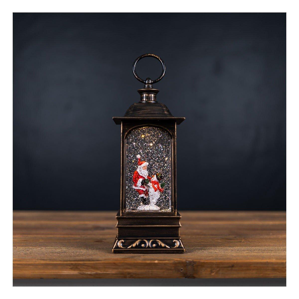 Illuminate your home this Christmas season with the stunning Lighted Lantern Snow Globe with Santa and Snowman. This piece features a whimsical dancing Santa and Snowman scene inside a lantern-shaped snow globe. The antique lantern design paired with the sparkley globe contents makes this set a great addition to any style of holiday decor. The piece also features a 6-hour timer function to save you the hassle of turning it on and off. A USB charging cord is included with purchase.