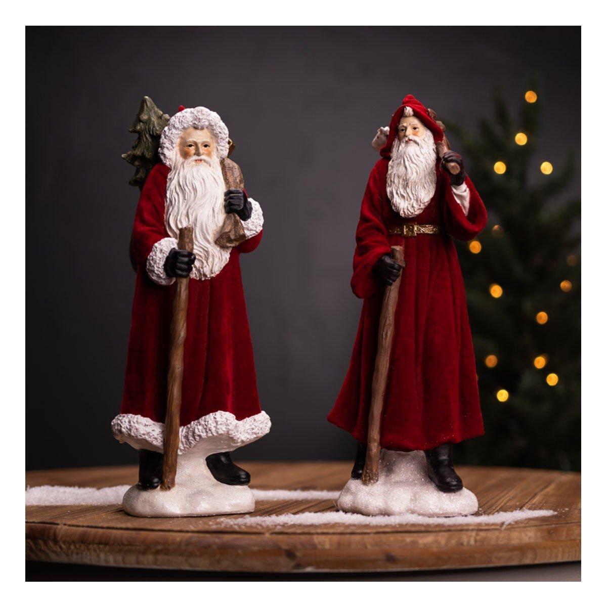 Light up the holiday season with a magical set of Hooded Santa with Staff figurines! This enchanting addition to your holiday decor is crafted from durable polyresin, and features a festive red and white flocked cloak, rustic staff and toy bag accents to bring a delightful touch of winter wonderland to any room. Give your home the perfect holiday flair with the characterful set of Hooded Santa with Staff figurines!