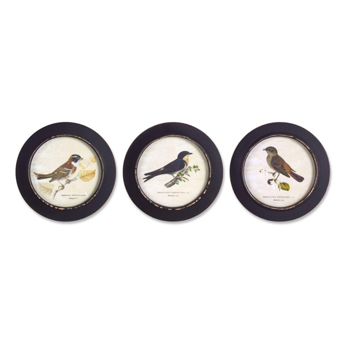 Adorn your walls with this stunning set of Round Framed Bird Prints. Featuring three assorted designs, the weathered black frames paired with the encyclopedia art design is the perfect combination to create a beautiful spring display. They can be displayed together to make a statement or throughout the home to accent your other decor. They would make a great addition to your cottage or country farmhouse style of decor. Featured in Melrose International's "Cottage Garden" collection.