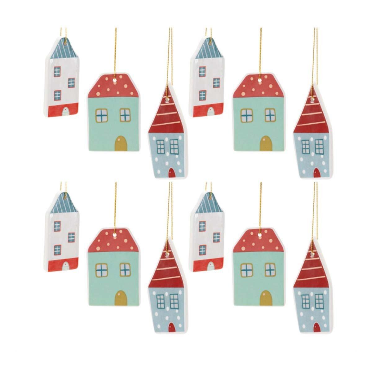 Add a modern touch of holiday cheer with these Ceramic Winter House Ornaments. Featuring wintry red and green tones with a glossy glazed finish, each ornament showcases charming house artwork in a variety of festive shapes. The delicate string hanger makes them easy to display on your Christmas tree, wreaths, or garlands. Sold in a set of 12 with three assorted designs, these ornaments are perfect for spreading the beauty of the season or gifting to loved ones.