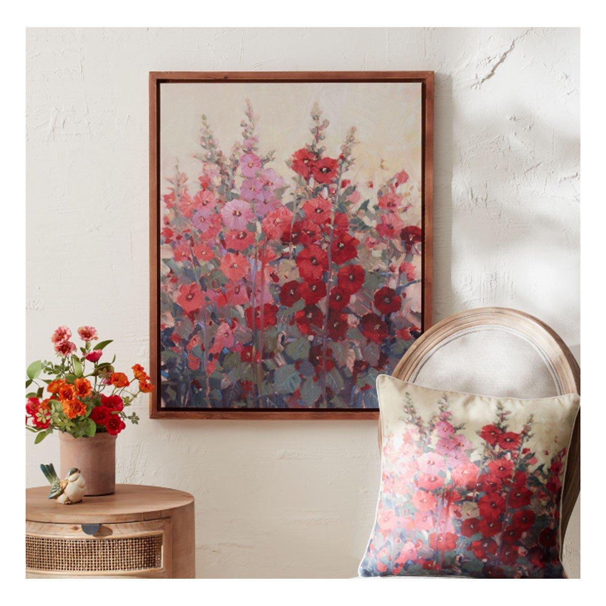 Adorn the wall of your home with this stunning Floral Canvas Art. Measuring 29" tall, this piece is a great fit for your French cottage or garden chic style of decor. The bright pink and red tones paired with the fir wood frame and hollyhock floral artwork are perfect to create a memorable display. The quality canvas composition is sure to endure for seasons to come. Display this piece above your mantle or console table display to make a statement, or gift the artwork to a special someone in your life to share the beauty!