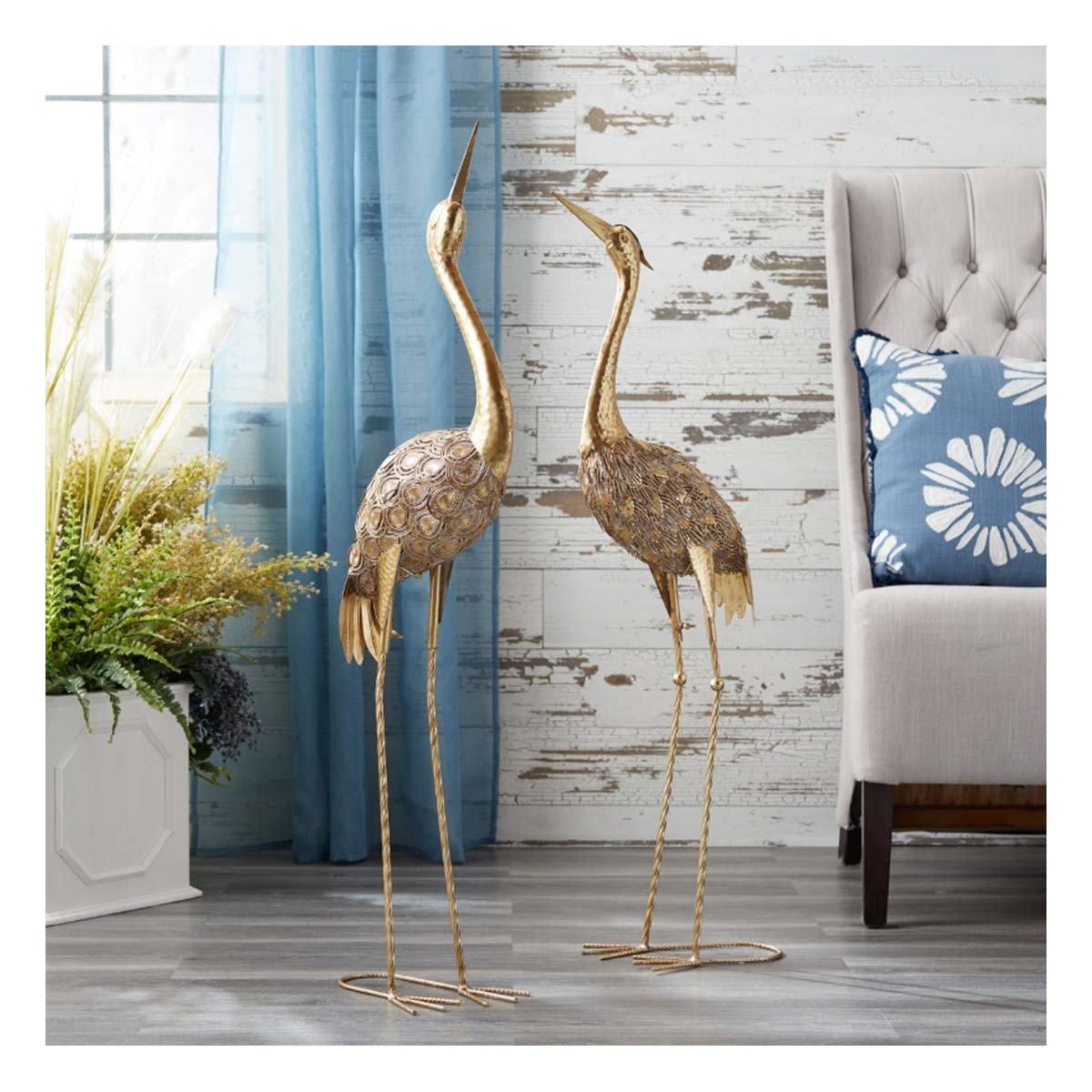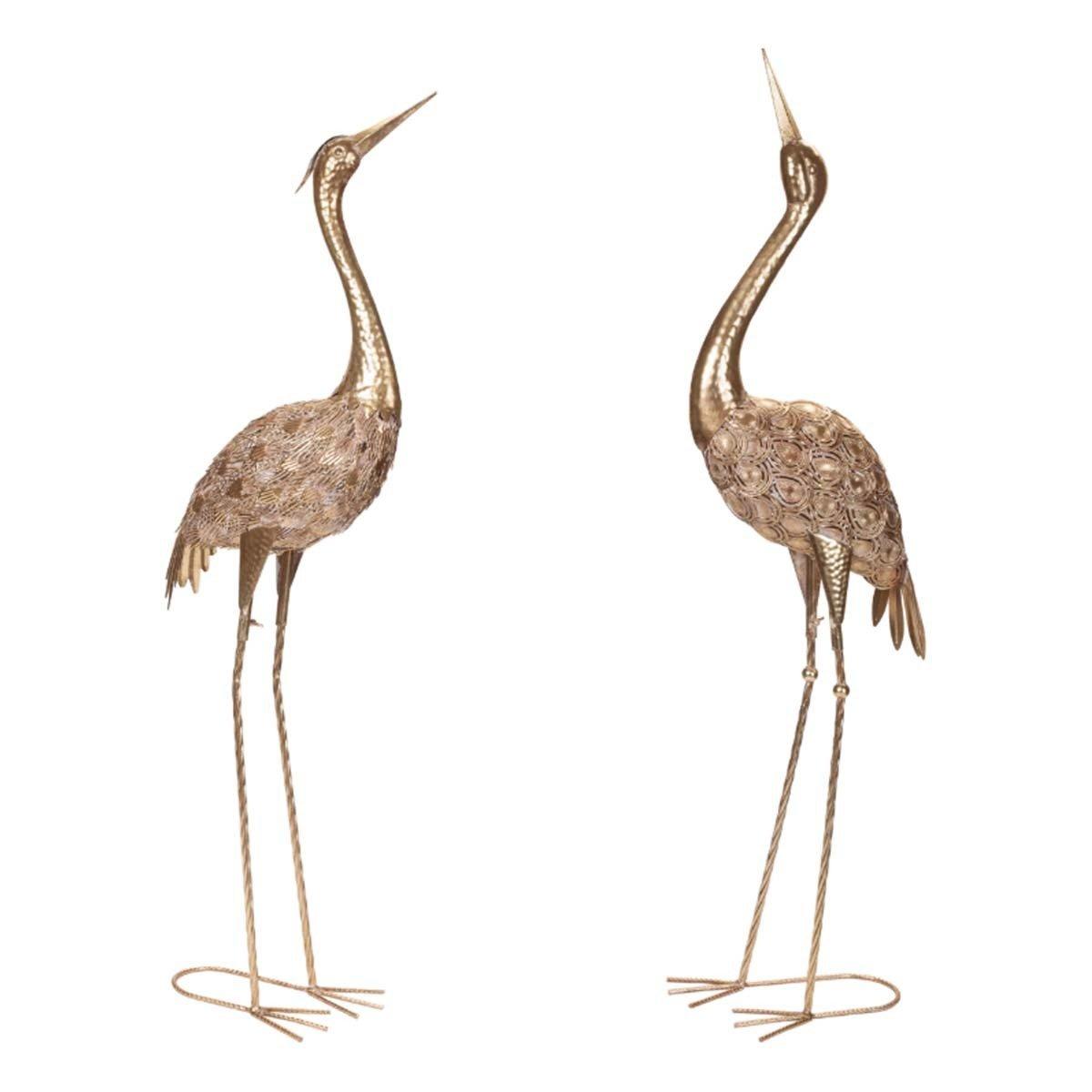 Add elegance and a touch of nature to your décor with this Hammered Metal Crane Décor set. Featuring chic gold tones and metallic touches, these cranes are designed with a hammered metal finish on their legs and necks, creating a sophisticated texture. The ornate cut-out metal body adds artistic detail to the crane design. Sold in a set of two assorted heights, these cranes are perfect for enhancing your nautical or coastal lakehouse style.