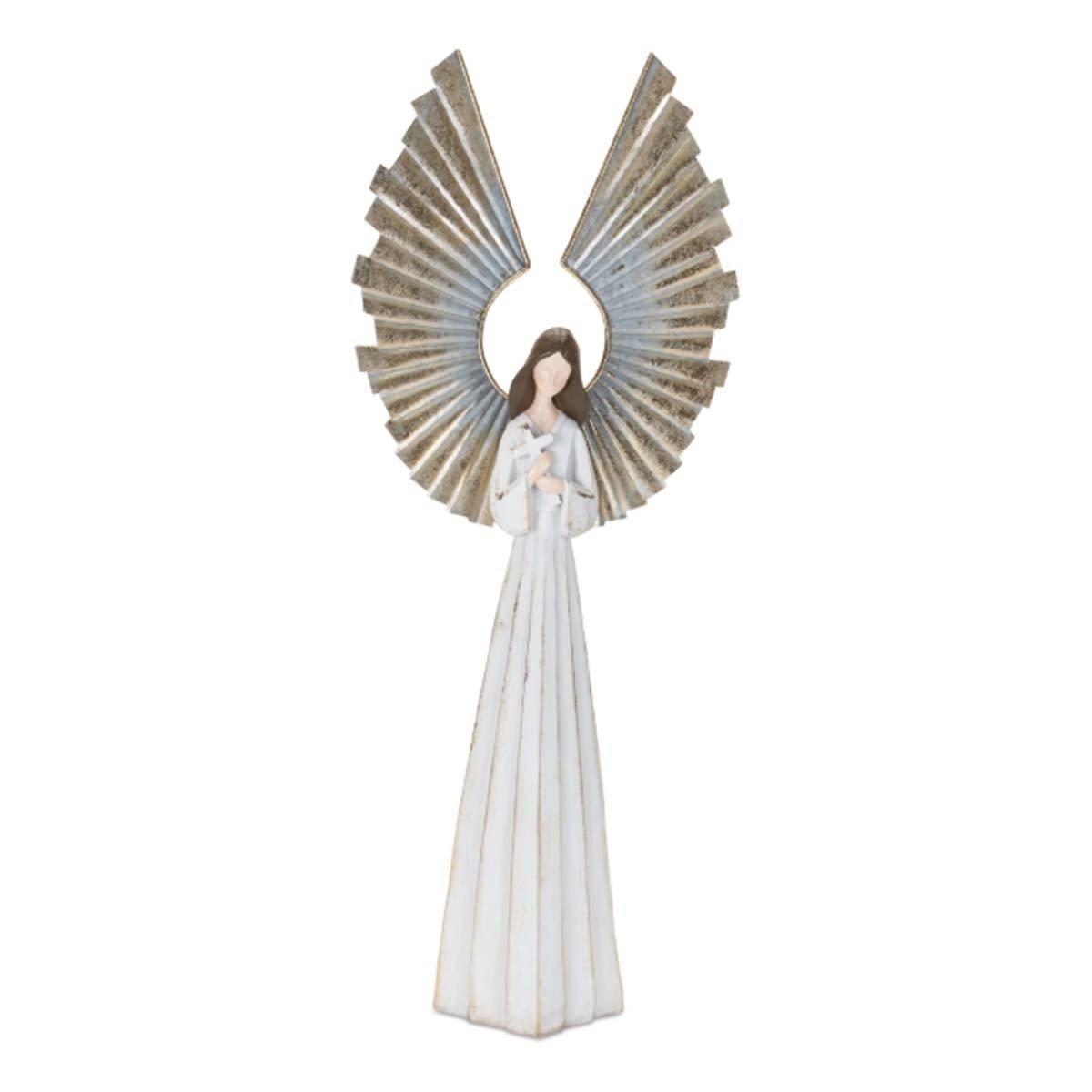 Grace your home with the serene beauty of this holiday angel statue. Designed in chic white and gold tones, this elegant figure features a calm, peaceful expression, flowing robes, and distressed metallic wings for a soft, vintage-inspired touch. A brushed gold finish adds subtle shimmer, making it a standout piece on mantels, shelves, or tabletops. Pair it with nativity figurines, seasonal florals, or decorative trees to complete a heartfelt holiday display filled with warmth and grace.