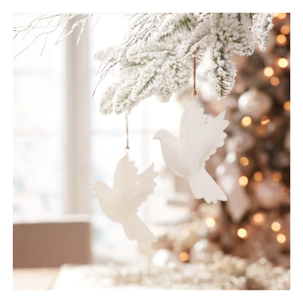 Add a touch of traditional holiday cheer with the Metal Dove Bird Ornament. Crafted in wintry white tones with a glossy finish, this elegant dove shape brings a serene beauty to your Christmas tree. Each ornament features a rustic jute string hanger for easy display. Sold in a set of 6 matching pieces, these doves are perfect for enhancing your holiday décor or for gifting to spread the spirit of Christmas to loved ones.
