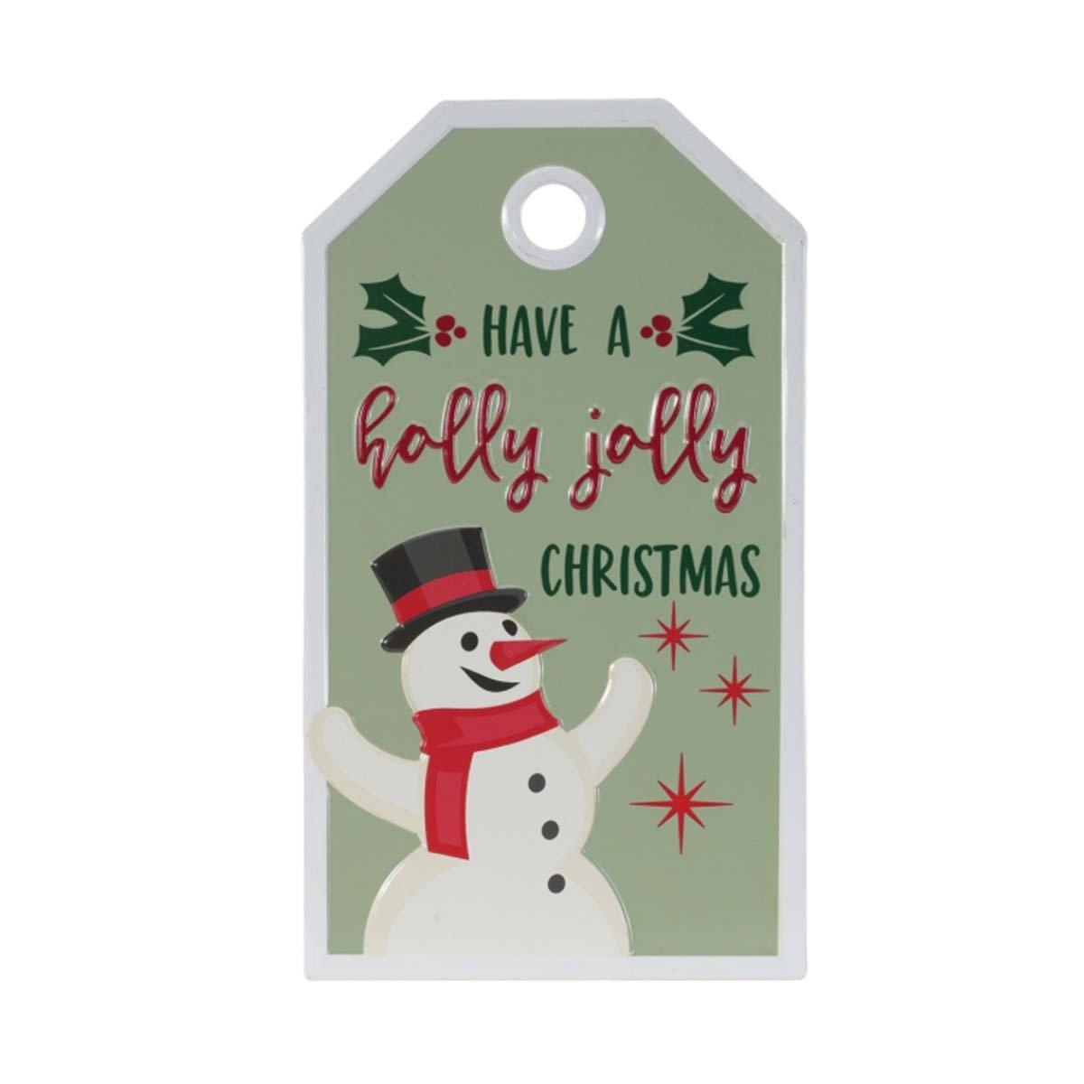 Bring some holiday cheer into your home with the Metal Snowman Christmas Sentiment Tag. Featuring festive green and red tones, this whimsical piece showcases a charming snowman design along with the beloved sentiment, "Have a Holly Jolly Christmas," complemented by holly leaf accents. The piece comes with a sawtooth hook on the back for securing it safely to the wall of your home. Display this joyful tag in your living room or entryway to spread some holiday spirit, or gift it to a loved one to share the festive beauty.