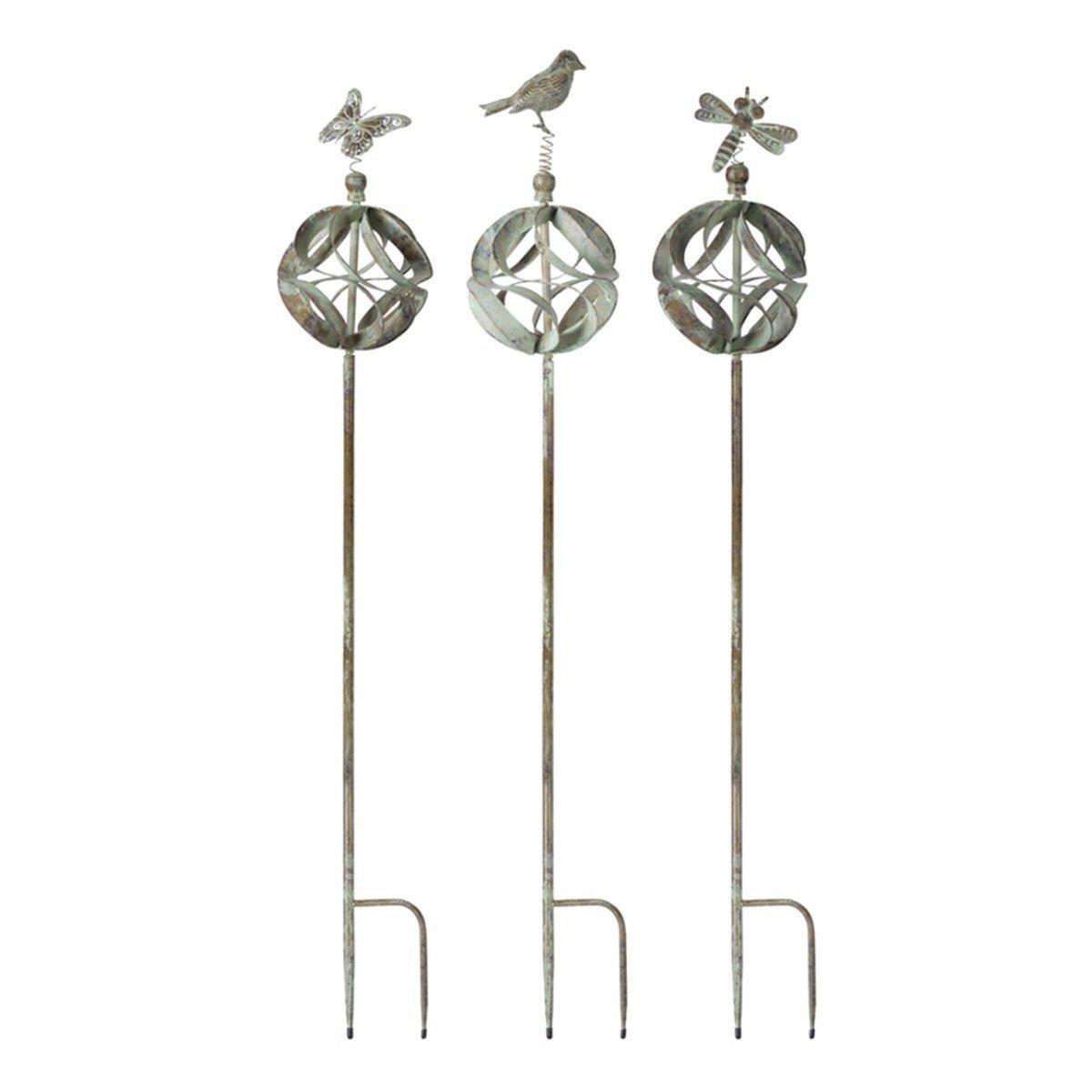 Melrose International Ornamental Metal Garden Stake with Bird and Insect Accents (Set of 3)