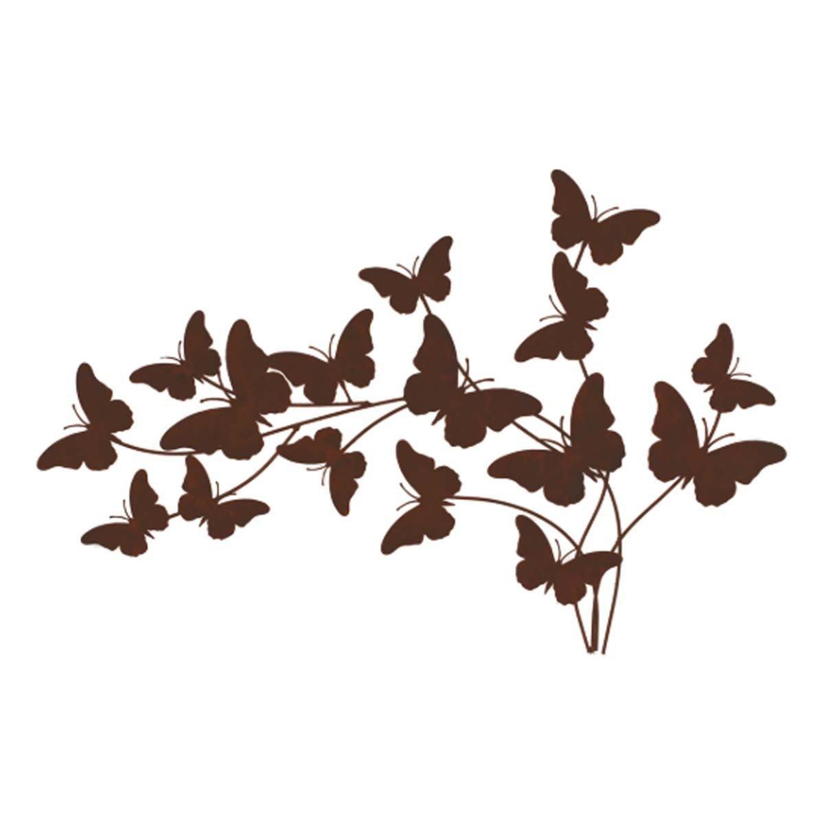Add a friendly, nature-inspired touch to your outdoor decor with this Rusted Metal Butterfly Wall Sculpture. Measuring 28.75 inches long and 18 inches high, this piece features delicate butterfly shapes in dark brown tones with bronze accents, all enhanced by a rustic distressed finish. The piece comes with two nail holes on the back for securing it safely to the wall of your home. Perfect for hanging on your garden fence or front porch, this whimsical sculpture brings a delightful, natural element to your space.