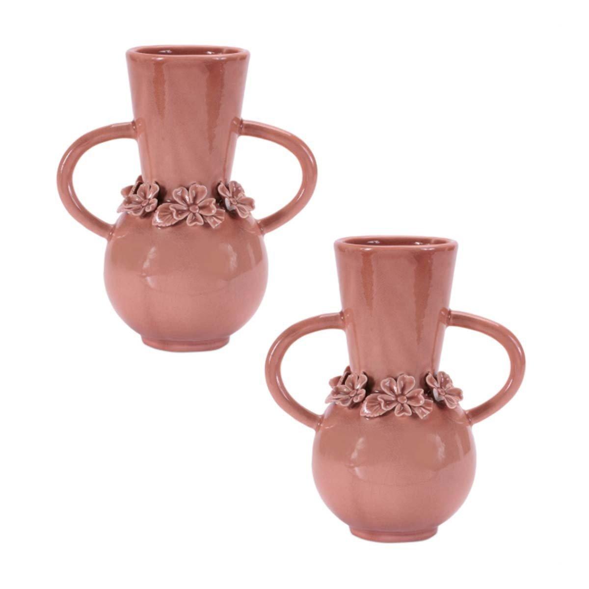 Bring soft elegance to your space with the Stoneware Vase with Floral Accent. Featuring soft mauve pink tones and a shiny glazed finish, this vase combines a traditional amphora shape with delicate three-dimensional stoneware flower accents. Sold in a set of two matching pieces, it's perfect for showcasing fresh garden stems or as a standalone accent piece. Display it on your bookshelf, mantle, or coffee table to enhance your garden chic or eclectic bohemian décor.