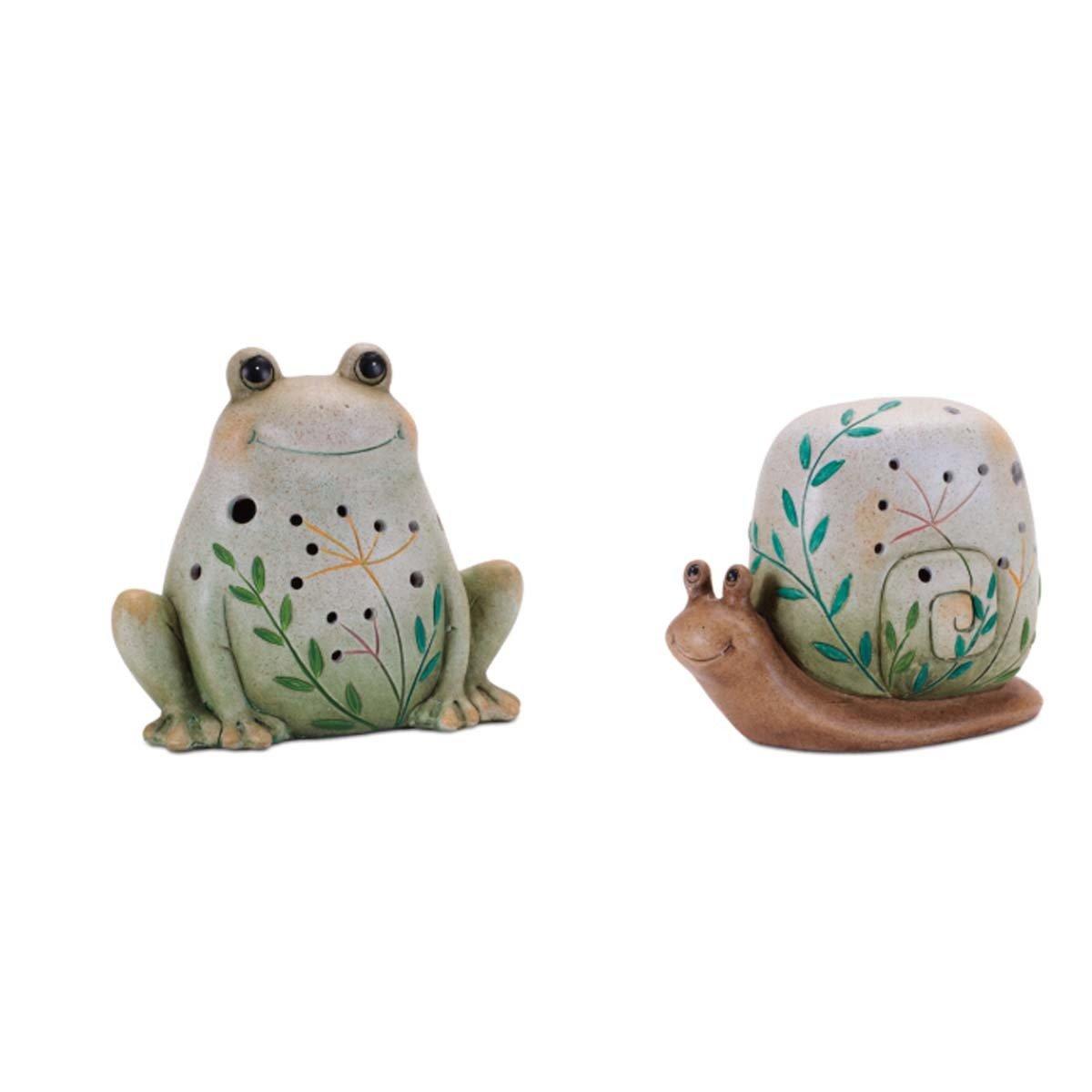 Add a whimsical touch of nature with the Terra Cotta Frog and Snail Décor set. Featuring earthy green and brown tones with a rustic speckled finish, these adorable frog and snail characters showcase delicate etched floral and leaf designs, complete with cut-out hole accents on the body and shell. Sold in a set of two assorted pieces, these charming figures can also be illuminated with a LED tealight or string lights for a magical glow. Perfect for brightening up bookshelves, tabletops, or mantels.