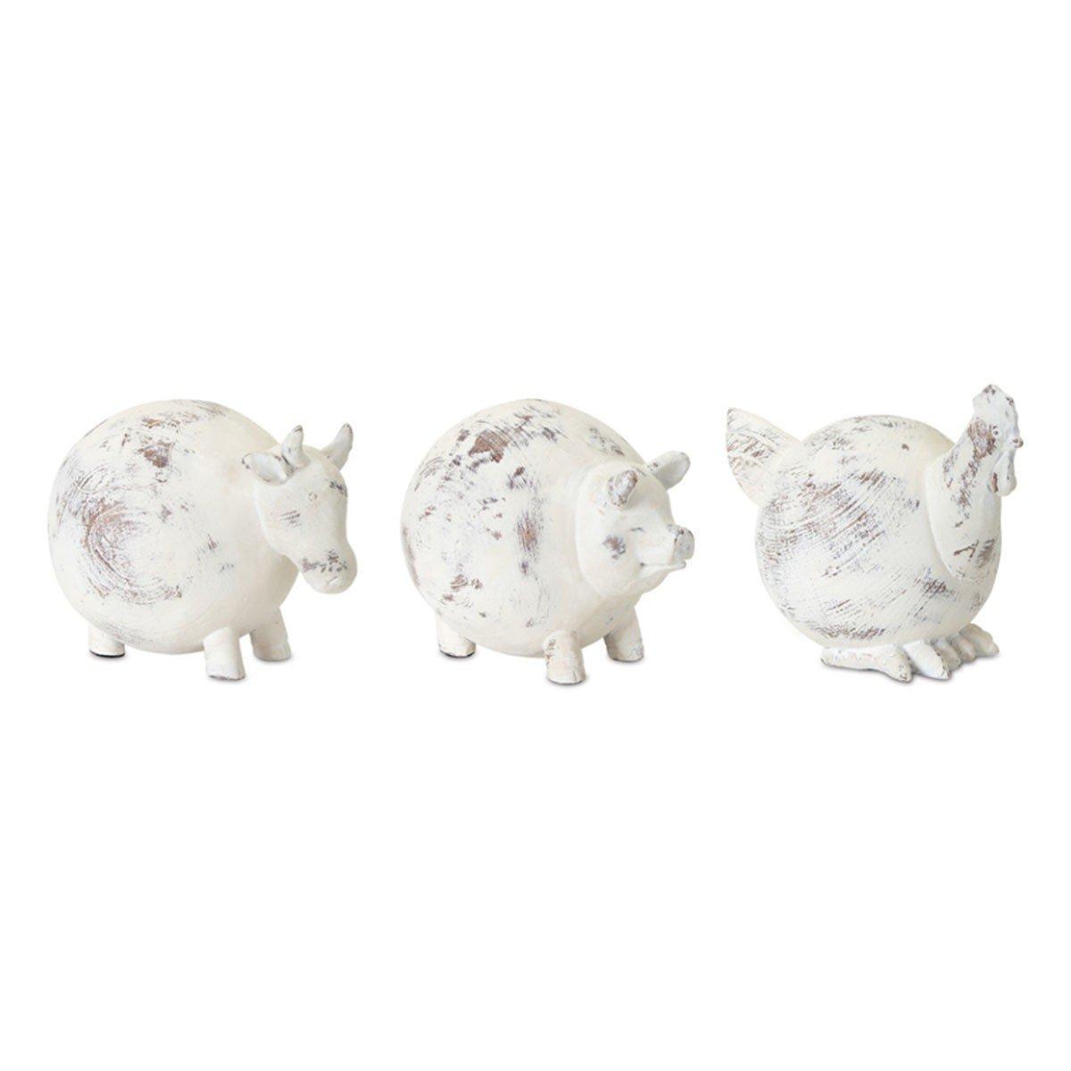 Show off your love for farm animals with this adorable set of Fat Farm Animal Figurines. Featuring three assorted designs, this set includes a cow, pig, and chicken. The weathered painted finish paired with the quality carved polyresin and stonepowder composition make this set the perfect addition to your country or farmhouse style of decor. Featured in Melrose International's "Simple Country" collection.