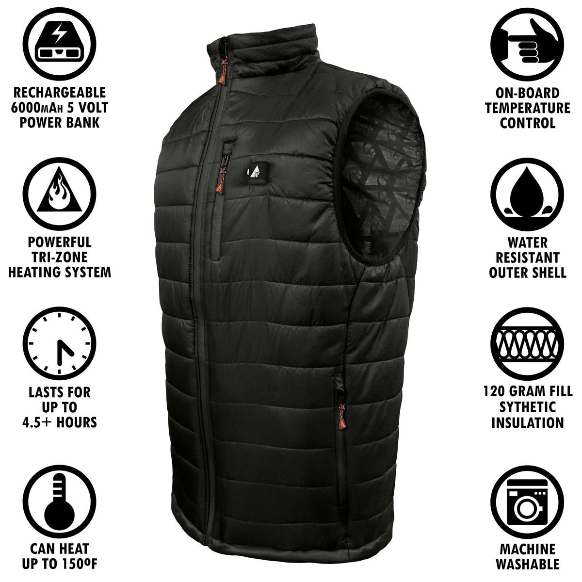 The ActionHeat insulated puffer vest is the perfect blend of fashion and utility. You can now look stylish while staying warm and cozy in all conditions. ActionHeat vests come with a super powerful ActionHeat 5-Volt 6000maH Power Bank. This power bank powers your garment and can also charge your phone, tablet, or any USB charged device. Note: Heating times will diminish if used to charge other devices. A one-touch LED button with 3 different heat settings, Low, Medium, and High, provides easy heat controls on the vest.