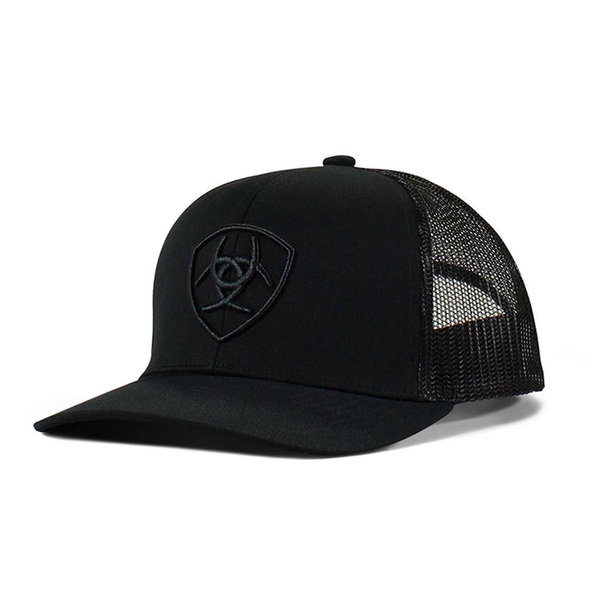 Nice Ariat mens cap by M&F Western Products. Black front panels and bill with embroidered shield logo in black. Black mesh back panels with snap back closure.