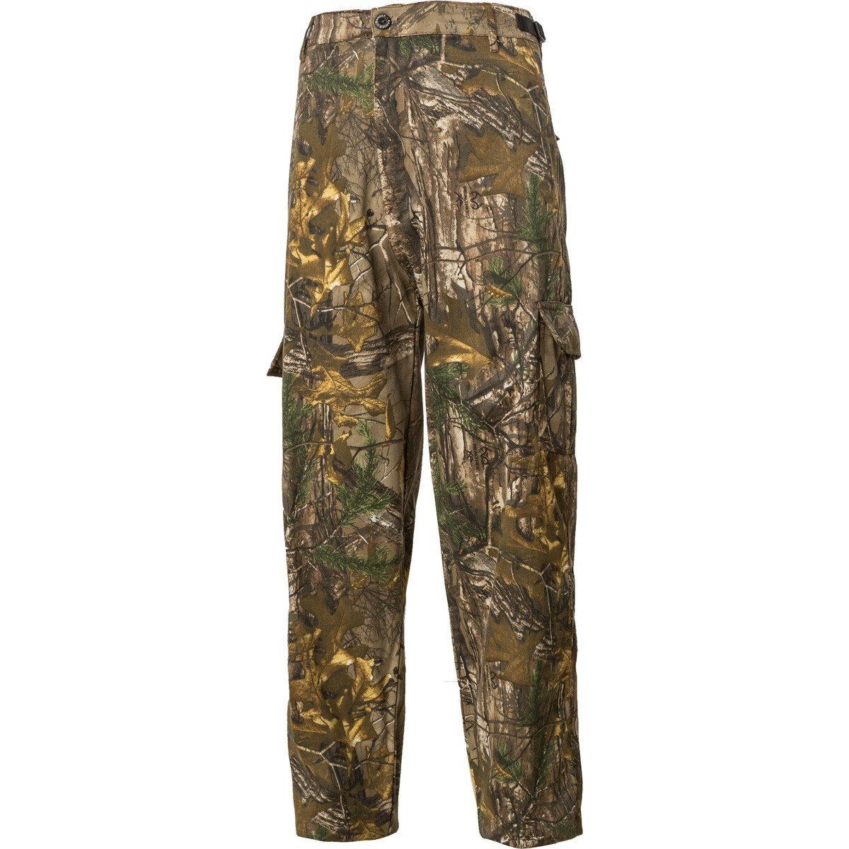 Made from a hefty poly/cotton brushed twill these pants offer the serious sportsman a wide range of features including two rear flap pockets two front swing pockets and a large cargo pocket with flap closure on each leg. Additional features adjustable waist buckles.