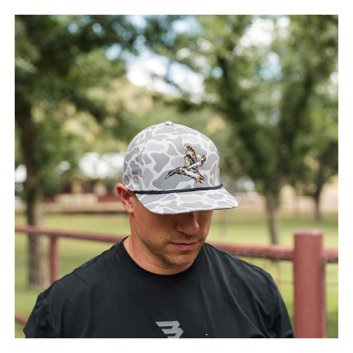 Blend in while standing out with the Diving Mallard Cap in our signature Classic Deer Camo. Featuring a dynamic embroidered mallard diving in mid-flight, this cap is a nod to the wild and a staple for any outdoorsman. The camo pattern offers a rugged, vintage-inspired look, while the structured fit and rope detail add a timeless feel. Whether you're chasing birds or just kicking back, this cap brings field-ready style wherever you go.