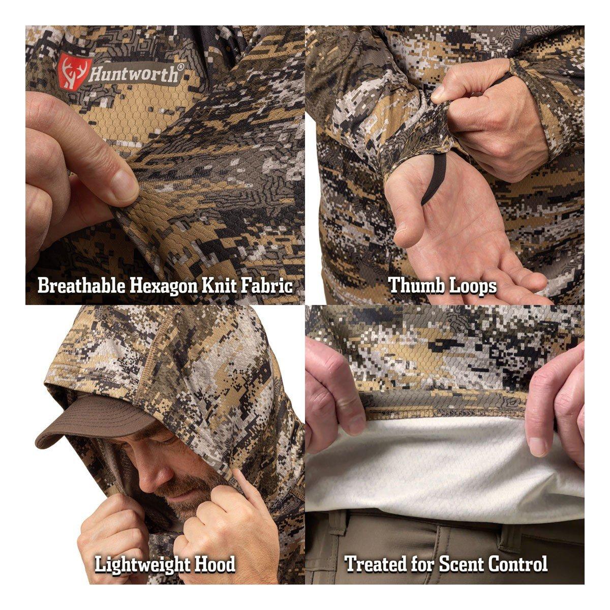Built for warm weather hunts, the men's Camden hooded shirt in Tarnen® camo will keep you cool and comfortable. Made with a durable, lightweight, hexagon-knit breathable fabric, the Camden wicks moisture to keep you dry. The attached hood provides head and neck protection from insects and sun. Wear by itself or as a layering piece. The hidden thumb straps make it easy to layer, and the tag-free collar provides all-day comfort.