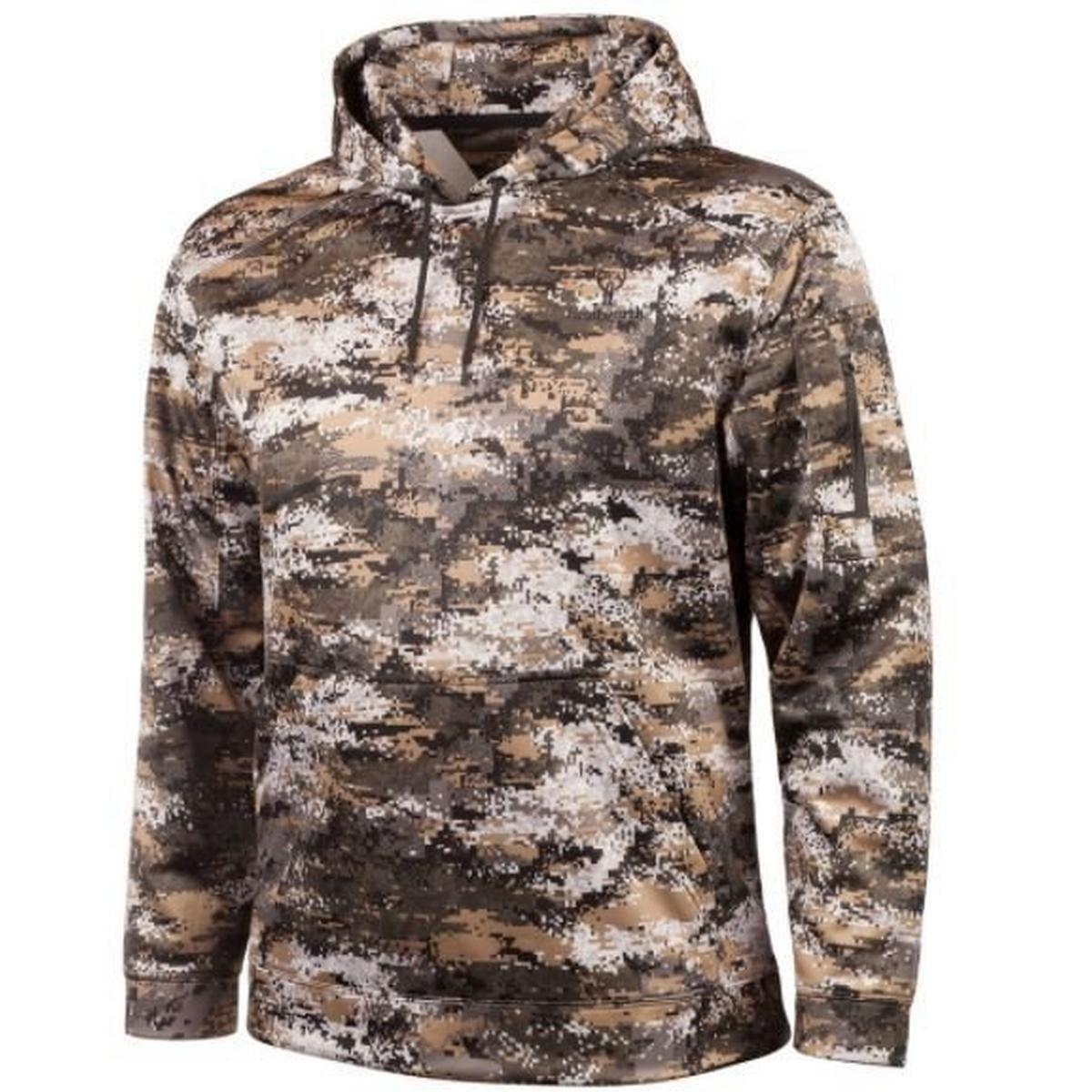 Everyone needs a hoodie like this: Silky smooth, warm and comfortable with lots of storage and a great fit. The 2-way stretch performance fleece features Disruption® digital camo. You have plenty of storage with the kangaroo front pocket and convenient zippered sleeve patch pocket, so it’s easy to keep your things close. A second layer of performance fleece makes the hood cozy warm and a secured draw cord helps keep the cold out. This hoodie has it all.