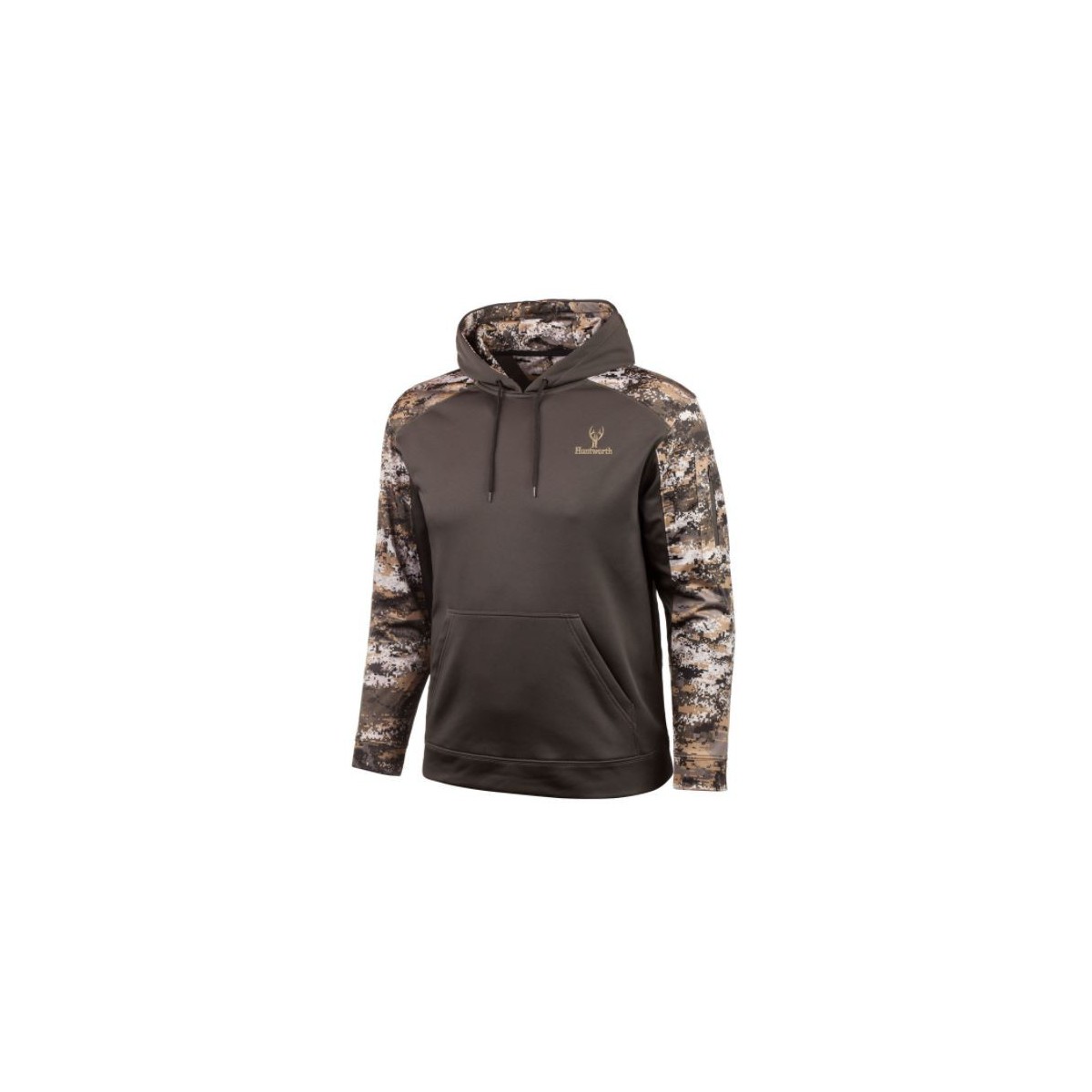 Get performance that goes anywhere with this fleece hoodie. It’s the perfect fit for your active outdoor lifestyle. The 260g, two-way stretch performance fleece provides incredible freedom of movement in all of your activities. Use as an outer layer on cooler days and warm your hands in the spacious kangaroo style pocket. Stash your phone or keys in the zippered bicep pocket when you’re on the go. The charcoal gray body and Disruption® digital camo sleeves and interior hood make this hoodie a fashionable and unique addition to your wardrobe.