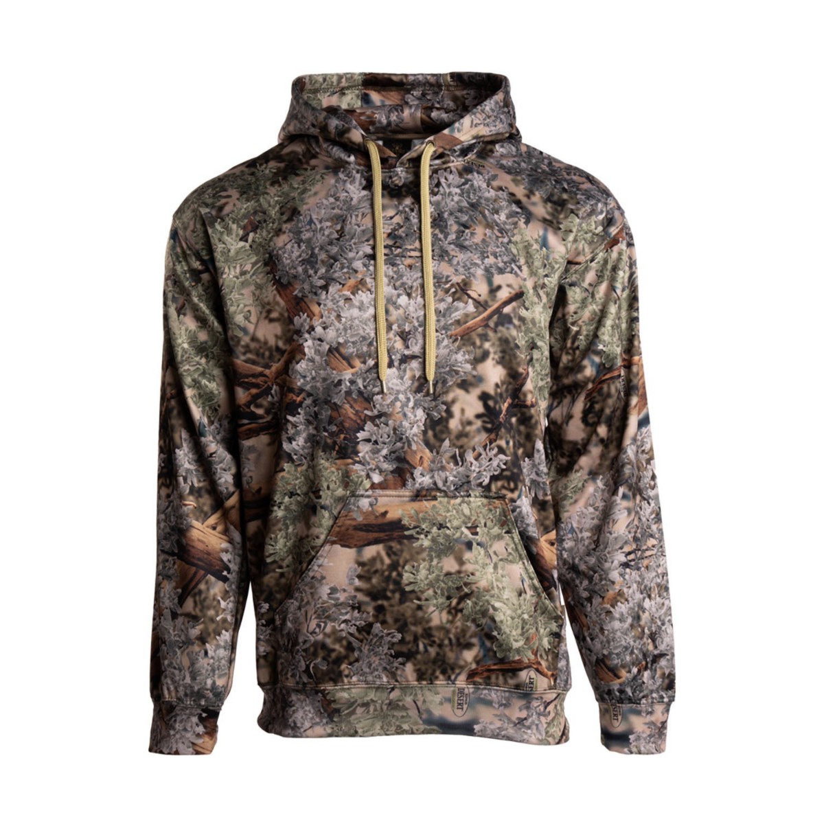 Hunter Hoodie now has an upgraded 8.5 oz. poly fleece material is soft, quiet, and built for performance with its quick-drying capability. Includes kangaroo pocket front and camo cuff on sleeve and waist for stylish look.