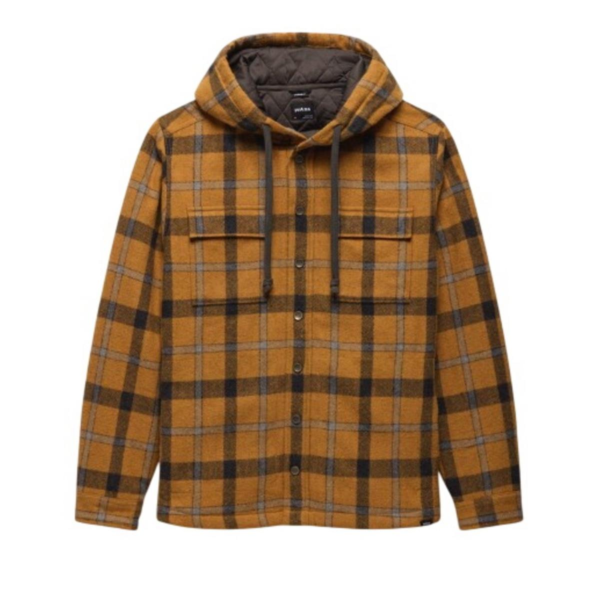 Recycled wool blend yarn dye woven flannel • Self-fabric weight: 300gsm • Quilted lining with polyester fill • Double chest patch pockets with hidden snap closure • Three piece hood with drawstring • Front side seam pockets • Adjustable snap cuffs • Exterior prAna woven label at bottom front hem • Standard Fit