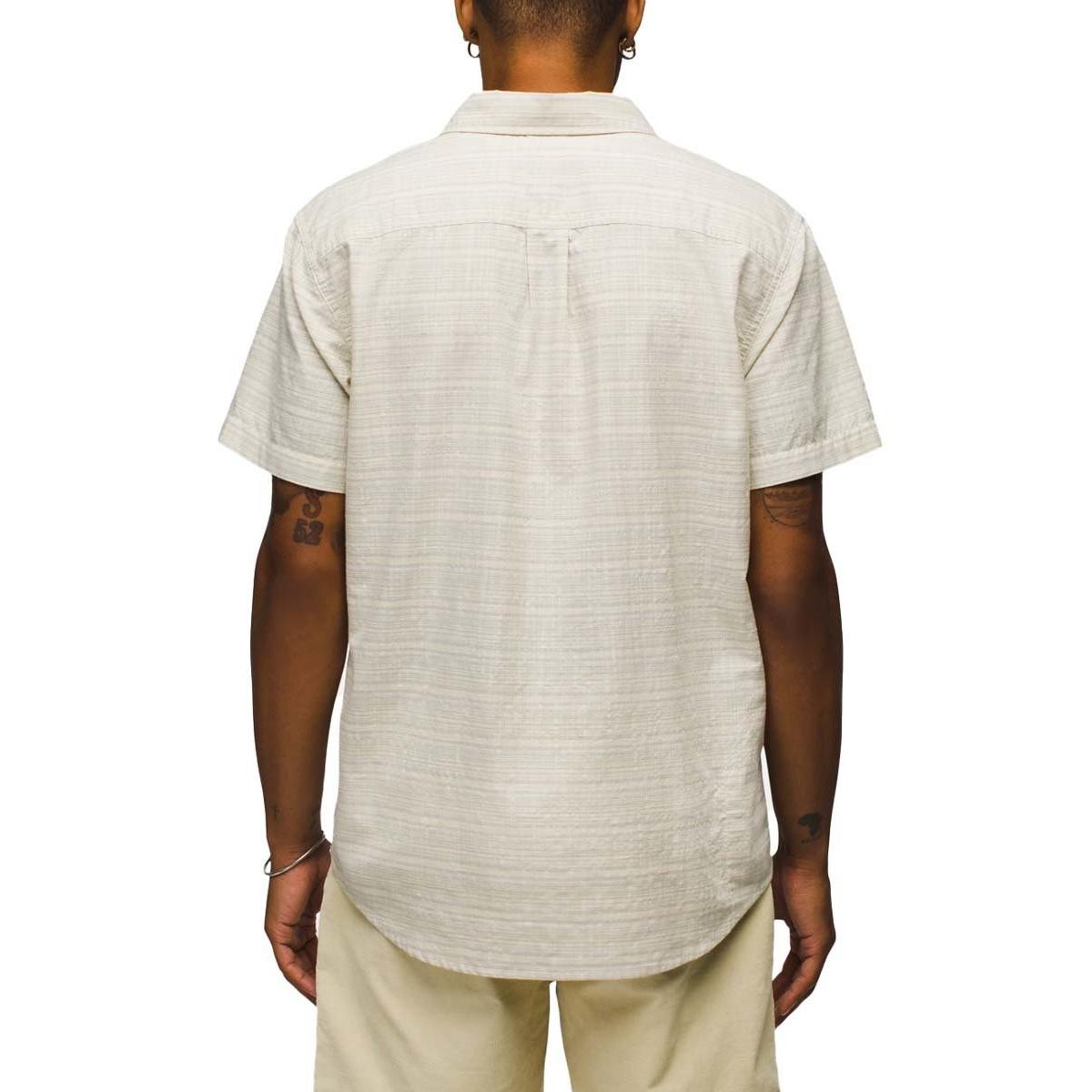 Organic cotton/ recycled polyester blend plain weave • Chalk and Flint colorways horizontal yarn-dye stripe • Maize colorway vertical yarn-dye stripe • Self-fabric weight: 105gsm • Front button half placket • Front left chest pocket • Interior side seam stash pocket • Back yoke • Exterior prAna woven label at front left hem • Faux corozo buttons • Standard Fit