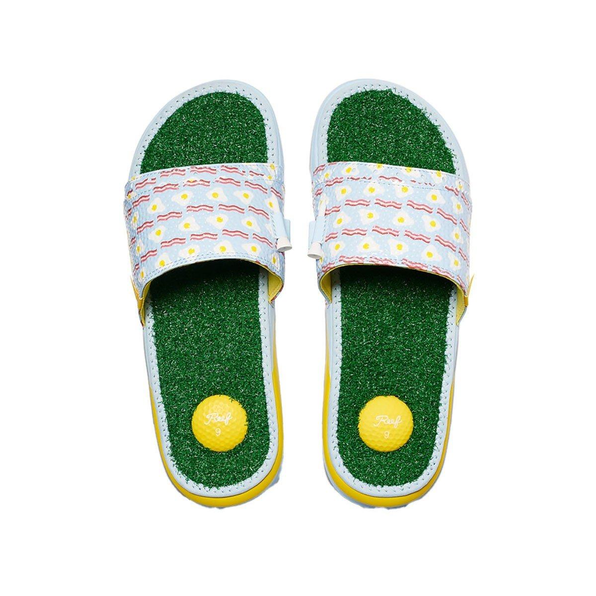 The Men's Reef Mulligan Slide Sandals are a perfect option to wear around the locker room or to grab a drink at the clubhouse after a round of golf. Featuring a synthetic leather upper, the Reef Mulligan Sandals upper strap has a golf ball-like texture and a tee holder too! The faux grass footbed on the Reef Mulligan Sandals provide plenty of cushioning comfort, while the golf ball heel pad adds interest and comfort. You'll also enjoy the non-marking outsole for traction on slippery surfaces. For a post-round shoe, try the Men's Reef Mulligan Slide Sandals.