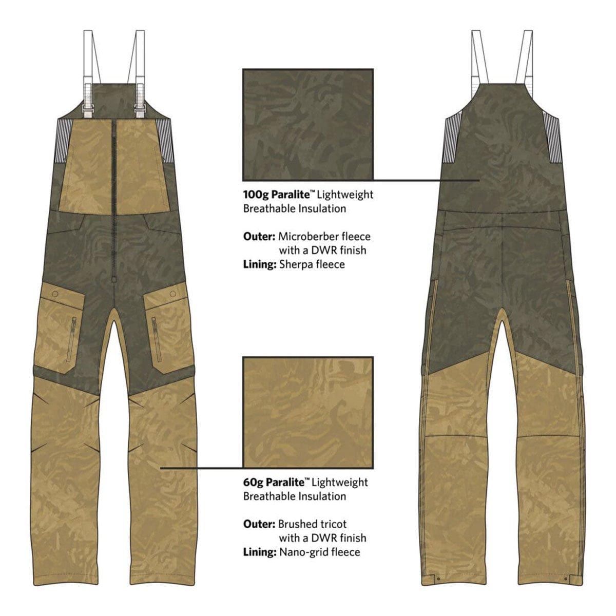 The exterior is crafted with ultra-quiet polyester microberber fleece on the seat and thighs for added warmth, while brushed tricot fabric is applied on the upper torso and below the knees. This blend of materials delivers targeted warmth and comfort. Inside, the bib features warm sherpa fleece in the upper portion and a nano grid fleece in the legs, strategically reducing unnecessary bulk and maximizing mobility without compromising warmth. Generous hip-high leg zips allow for easy temperature regulation and make putting on and taking off the bibs effortless.
