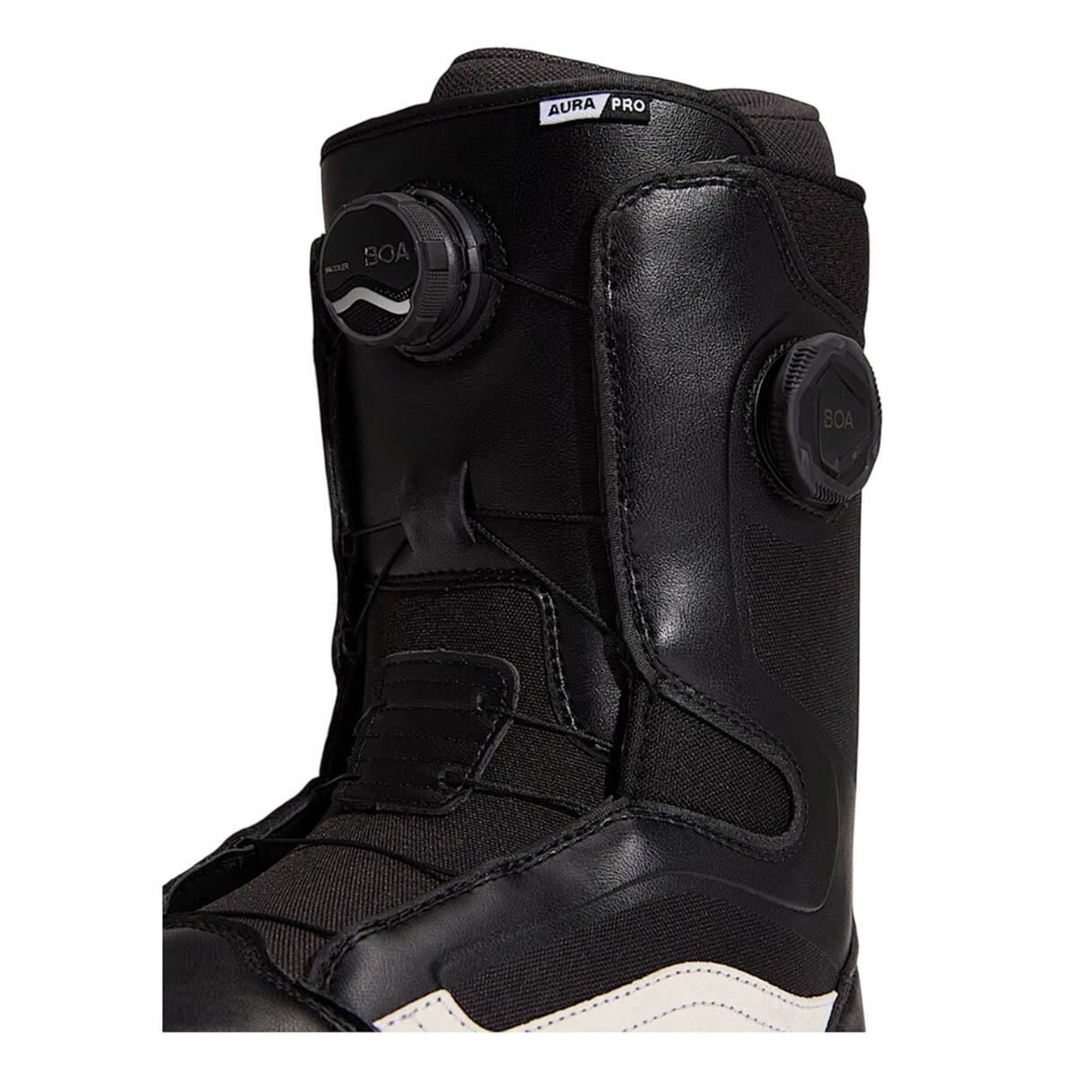 Featuring comfort, control, and style that only Vans can offer, the Aura Pro delivers on its versatile, hardworking reputation as the boot built to perform in all conditions. A dual-zone BOA® Fit System featuring Vans Custom Focus provides unlimited on-the-fly micro-adjustability backed by the customizable comfort and heel hold of the Custom Slide Guide. Add in a thermoregulating liner and high traction outsole for the sidecountry, and the Aura Pro exceeds expectations for comfort and performance.
