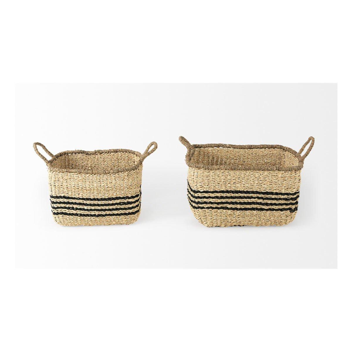 The Emma baskets measure 17.3L x 13.0W x 11.0H. The Emma baskets are carefully crafted in a woven pattern. These baskets are finished in a light brown warm tone, with two round handles on either side and black stripes through the middle. These baskets give the feeling of being somewhere warm and tropical, with their beautiful weaving detail and warm toned colors, they suit coastal and tropical styled spaces and are a instant head turner.