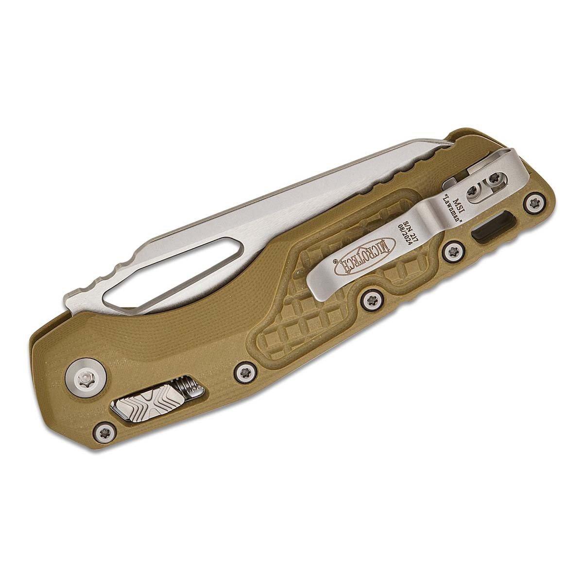 The MSI (Microtech Standard Issue) features Microtech's exclusive Bohler M390MK steel and its RAM-LOK technology. A large blade cutout gives ample room for reverse finger flicks as well as standard thumb opening with or without gloves. The RAM-LOK switch features Microtech's signature step pattern; simply pull down on the RAM-LOK and the blade flies open with a simple wrist flick. The injection molded handles are smooth and slightly tacky, providing great grip potential in both standard and reverse grips. The MSI is meant for heavy everyday use and is designed to become your all-time favorite folder for every situation. Microtech's exclusive Bohler M390MK steel offers nearly unparalleled edge retention and corrosion resistance. The MSI is rugged, durable, extremely high-value, and made in the USA.