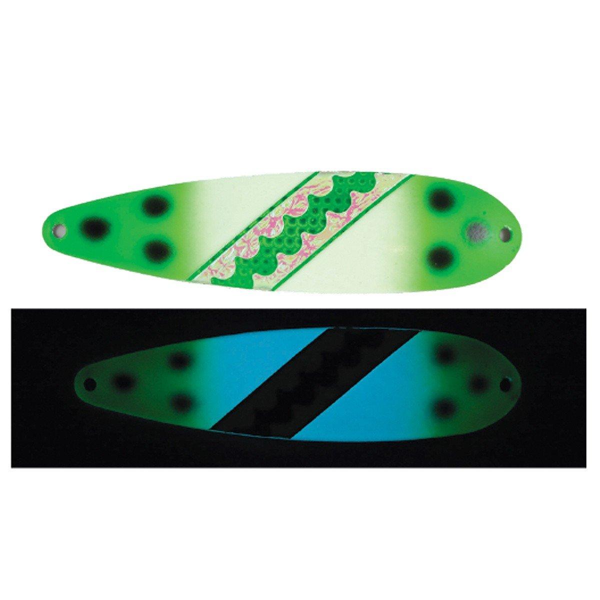 The Moonshine Lures Trolling Spoons are some of the brightest glowing lures that you'll find on the market today! After being exposed to natural or UV light, these spoons will be glowing for hours on end. That impressive glow is perfect for drawing in the attention of predators. Moonshine Standard Trolling Spoons are also ideal for being fished during the day as they are highly UV-reflective. Ideal for catching salmon, trout, walleye, pike, muskie, and striper, these spoons are sure to please even the pickiest angler.