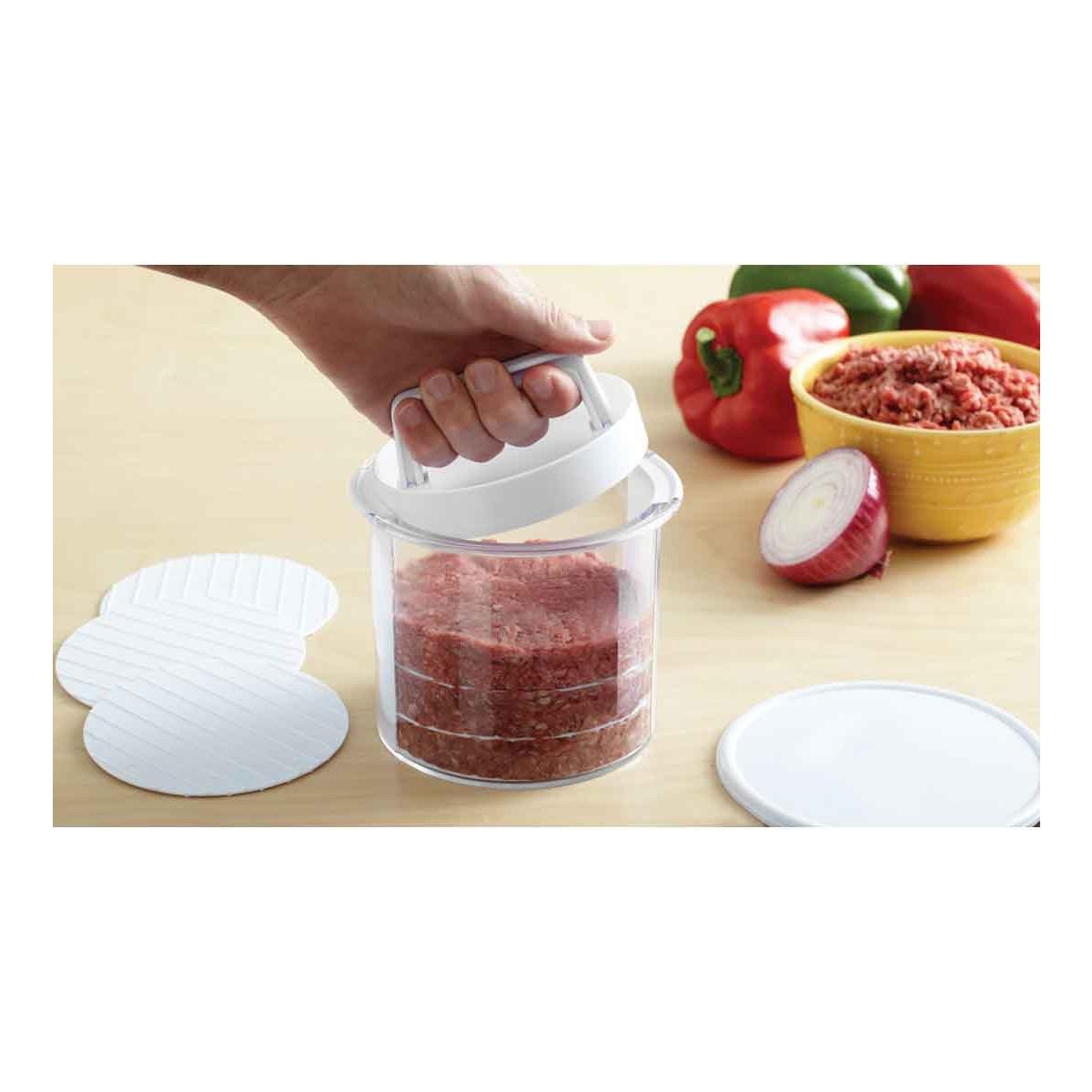 Burgers on the Go helps to make burgers on the go! Includes: burger press storage container & 8 multi layer discs. Make it - Save it - Grill Later (Patented). Save time with early preparation and store in refrigerator for later use.