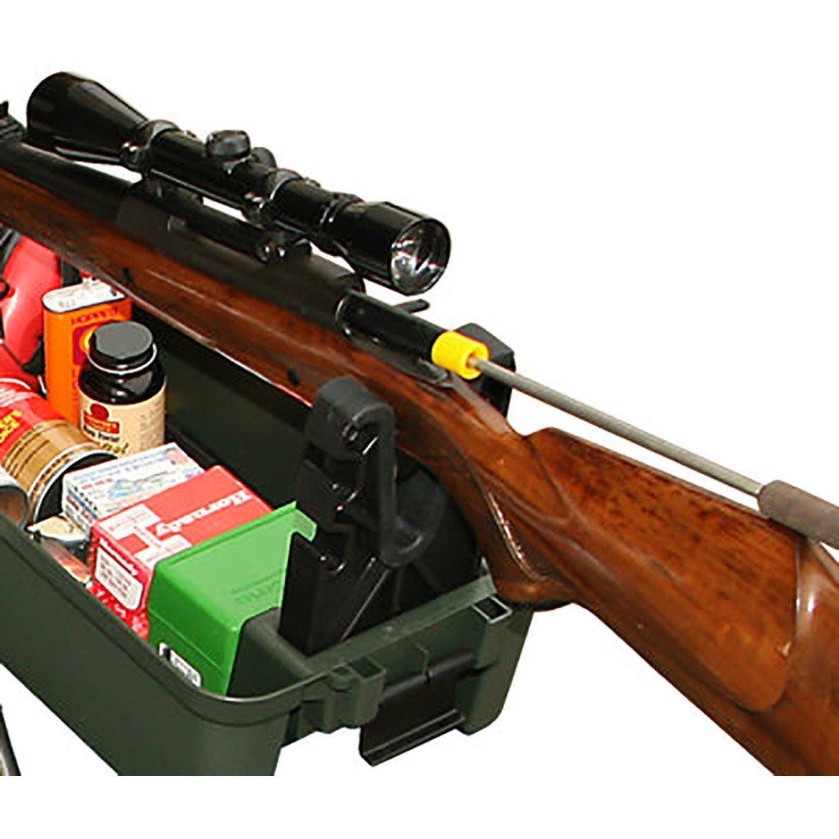 MTM is always looking for a way to improve your day at the range and we believe we have with the new Shooting Range Box. We feel it is the ultimate range box maintenance center that you're going to find on the market. Sporting a gun cleaning kit on top with a rifle maintenance cleaning stand base. It utilizes a two-piece design for compact transport and convenience. This setup is a must have for breaking in a new barrel testing loads and sighting in rifles. Everyone knows how you run the first box of ammo though your new barrel will effect it's group sizes the rest of its life. That is why competition brenchrest shooters clean their barrels on average every 6 or 7 shots.