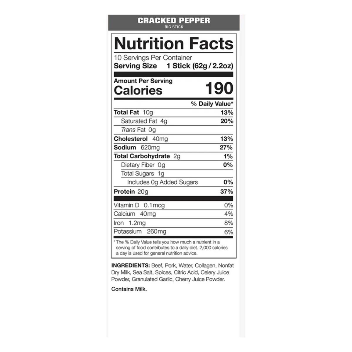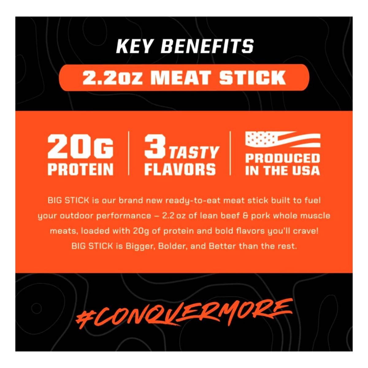 BIG STICK is ready-to-eat meat built to fuel your outdoor performance – 2.2 oz of lean beef & pork whole muscle meats, loaded with 20g of protein and bold flavors.