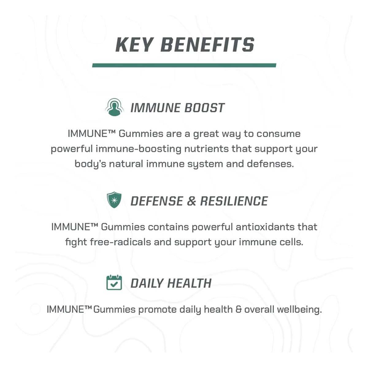 MTN OPS® IMMUNE Gummies are a quick, easy, and delicious way to consume powerful immune-boosting nutrients that support your body’s natural immune system and defenses.
