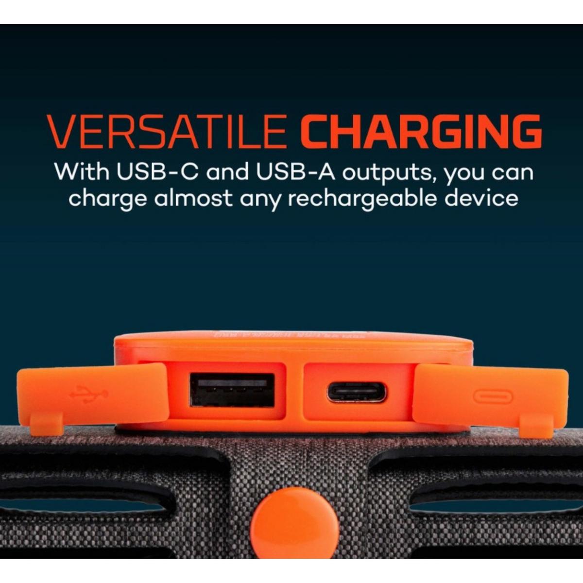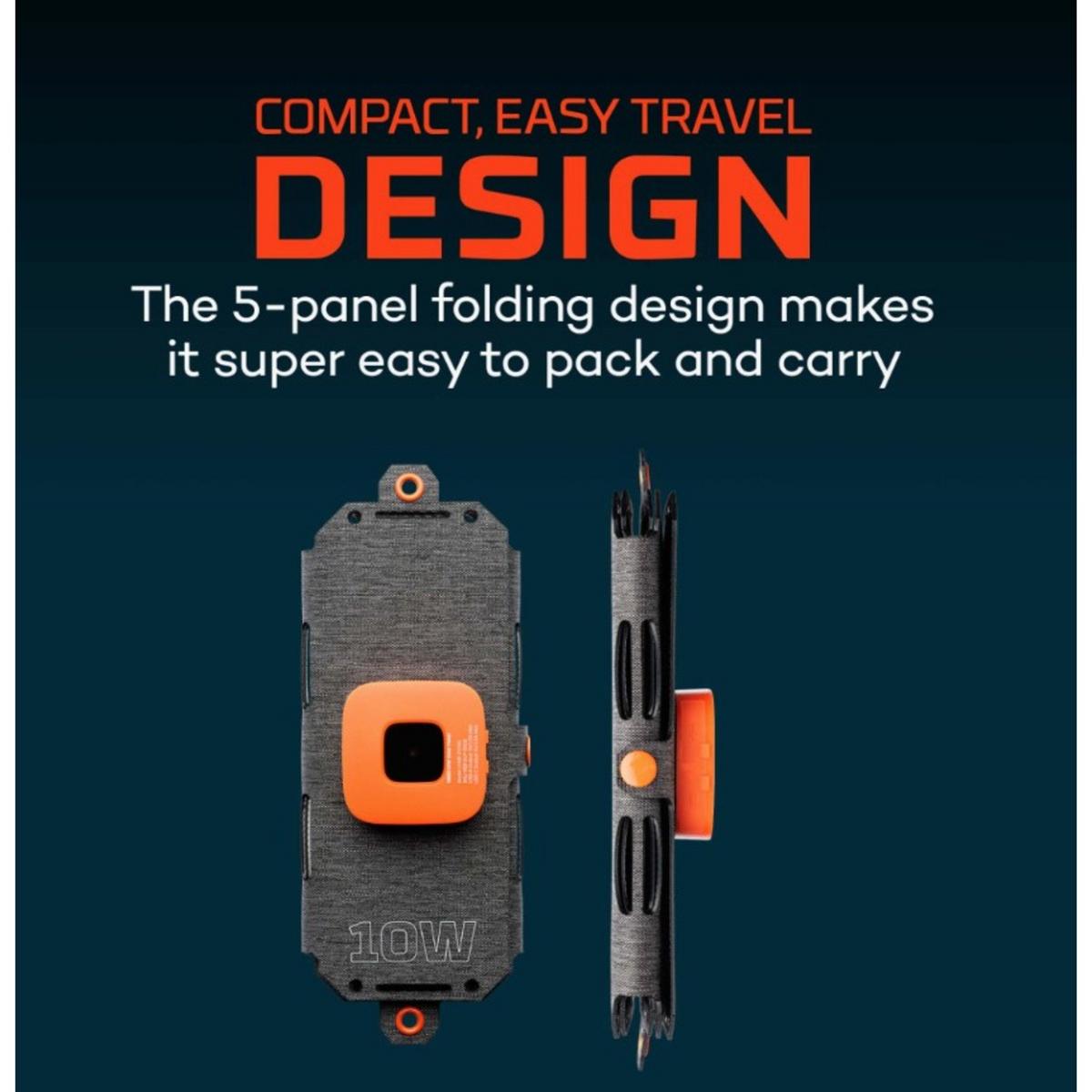 Stay charged wherever you go with the NEBO Reliance® 10W Solar Panel. With a 24.7% sunlight to solar energy conversion rate, it captures up to 10 watts of solar energy with its premium monocrystalline solar cells. This foldable solar panel provides up to 7.5 watts to its USB outputs to keep your phones, pocket-sized power banks, and other electronic devices fully charged with clean sustainable energy from the sun. Unfold it and point it towards the sun, or use the grommets to hang it in the perfect sunlight. At just over half a pound, it is super lightweight, and the 5-panel folding design makes it super portable so you can harness the power of the sun wherever you go.