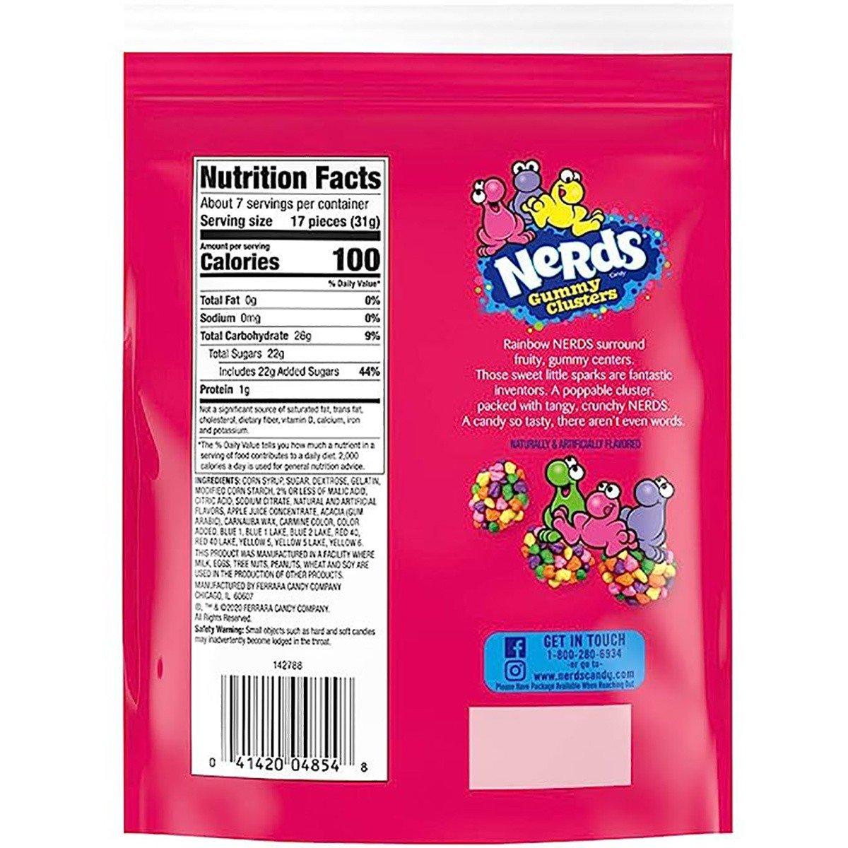 Nerds Gummy Clusters combine the crunch of original Nerds candies with a chewy, gummy center in a tangy blend of sweet fruit flavors. Playful and fun to snack, each poppable cluster is covered in classically crunchy Nerds candies with a sweet gummy hiding just below the surface. Each resealable package is festooned with those crazy Nerds characters that everyone adores.