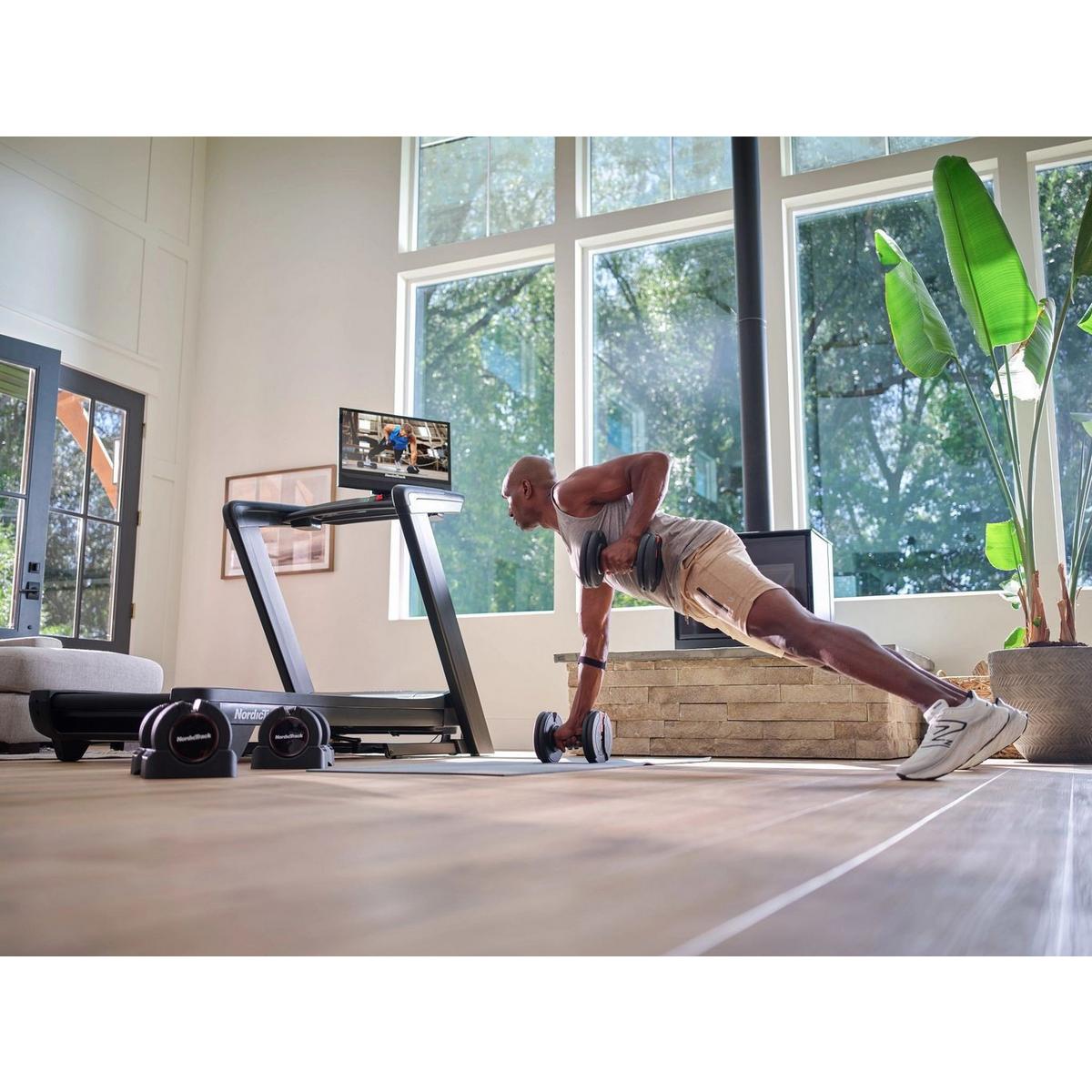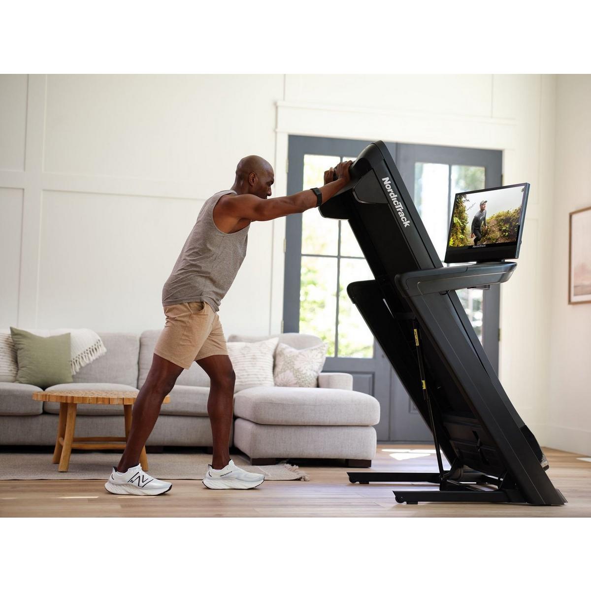 About the Commercial 2450 Treadmill: The NordicTrack Commercial 2450 Treadmill is the dedicated runner’s go-to treadmill. This smart treadmill can reach speeds of up to 14 MPH (4:17 minutes-per-mile pace), fast enough that, if you’re up for the challenge, you could run a sub-2-hour marathon. This high-speed capability makes it ideal for interval training. The adjustable 12% incline to -3% decline allows you to train with precision, mimicking the exact gradients you’ll face in your race. This specificity not only builds powerful leg strength and endurance by targeting different muscle groups but also enhances cardiovascular fitness and increases calorie burn through more efficient heart rate elevation. The 24” HD touchscreen pivots and tilts for optimal viewing, whether you’re running or following off-treadmill workouts. The RunFlex™ cushioning is engineered specifically for runners. It offers the perfect balance, ensuring you get maximum energy return with every stride, without sacrificing the support you need. The motor has been engineered for enhanced acoustics and durability, delivering a quiet, smooth performance. During your workout, the AutoBreeze™ fan keeps you cool, and a USB-C port lets you charge your phone while you move. After your workout, this foldable treadmill easily folds and rolls away to save space, perfect for your home gym.