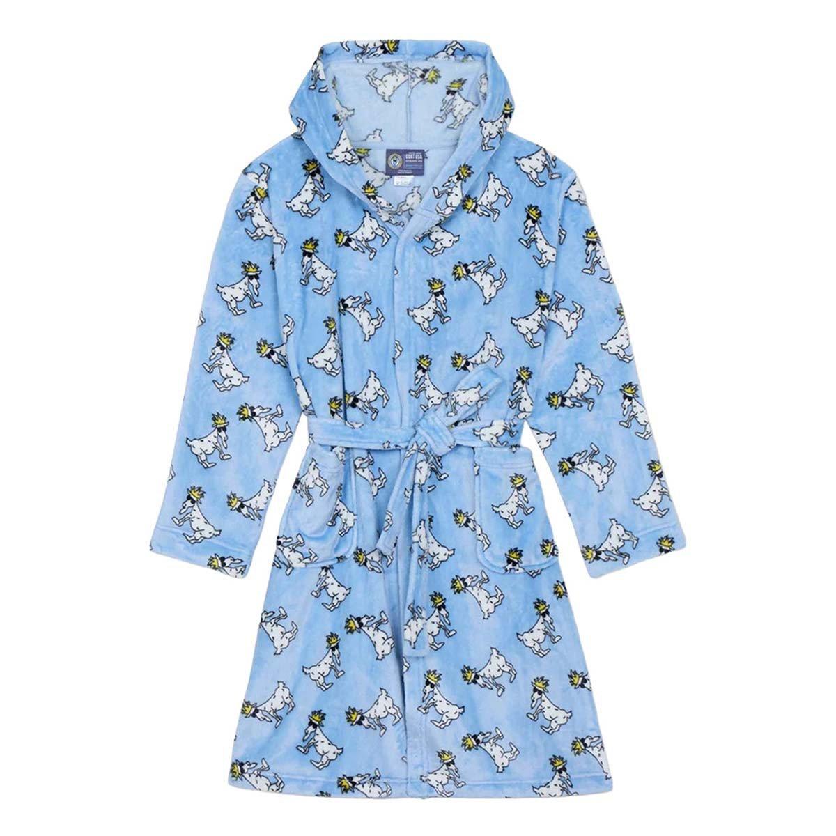 Wrap yourself in warmth and fun with the Kids' OG Bath Robe, designed just for the younger GOAT fans. Crafted from cloud fleece for unmatched softness, this robe keeps kids warm and snug whether they’re opening presents, sipping cocoa, or winding down after a day of winter play. The hooded kimono style, roomy patch pockets, and self-belt make it as practical as it is fun. Finished in our signature Carolina Blue with an all-over GOAT USA print, it’s a cheerful piece that brings comfort and joy to family lounging.