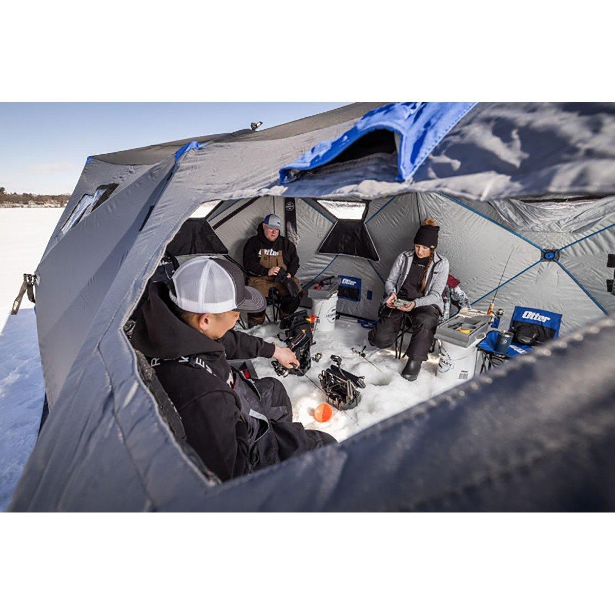 The Otter Vortex Pro Monster Hub Shelter is your key to a roomy ice fishing shelter this winter. Fit up to 8 anglers in this Otter Vortex Pro that features reinforced corners and a wide base for a maximum fishing area. This 5-sided 132 sq ft Monster Hub shelter offers a triple layer shell that is durable, warm and helps to reduce condensation buildup. Plus, the outer shell helps to block wind paired with the warm thermal inner shell that helps to trap in heat all day long. Anchor down this Otter Vortex Pro shelter with the ice-lock anchoring system that ensures your ice shelter is stable and grounded to the ice. Sit comfortably and warm with up to 8 fishing friends in the spacious Otter Vortex Pro Monster Hub Shelter.