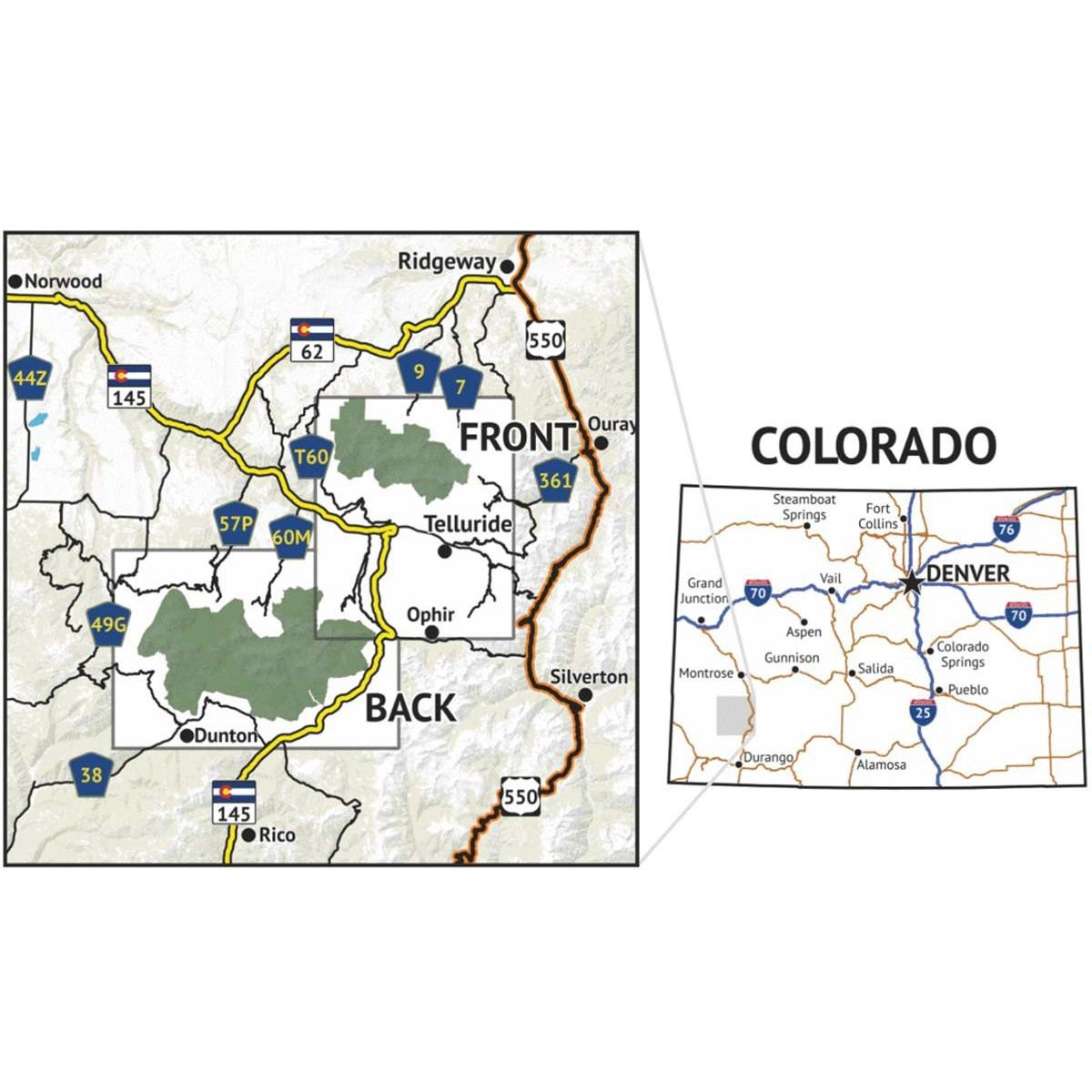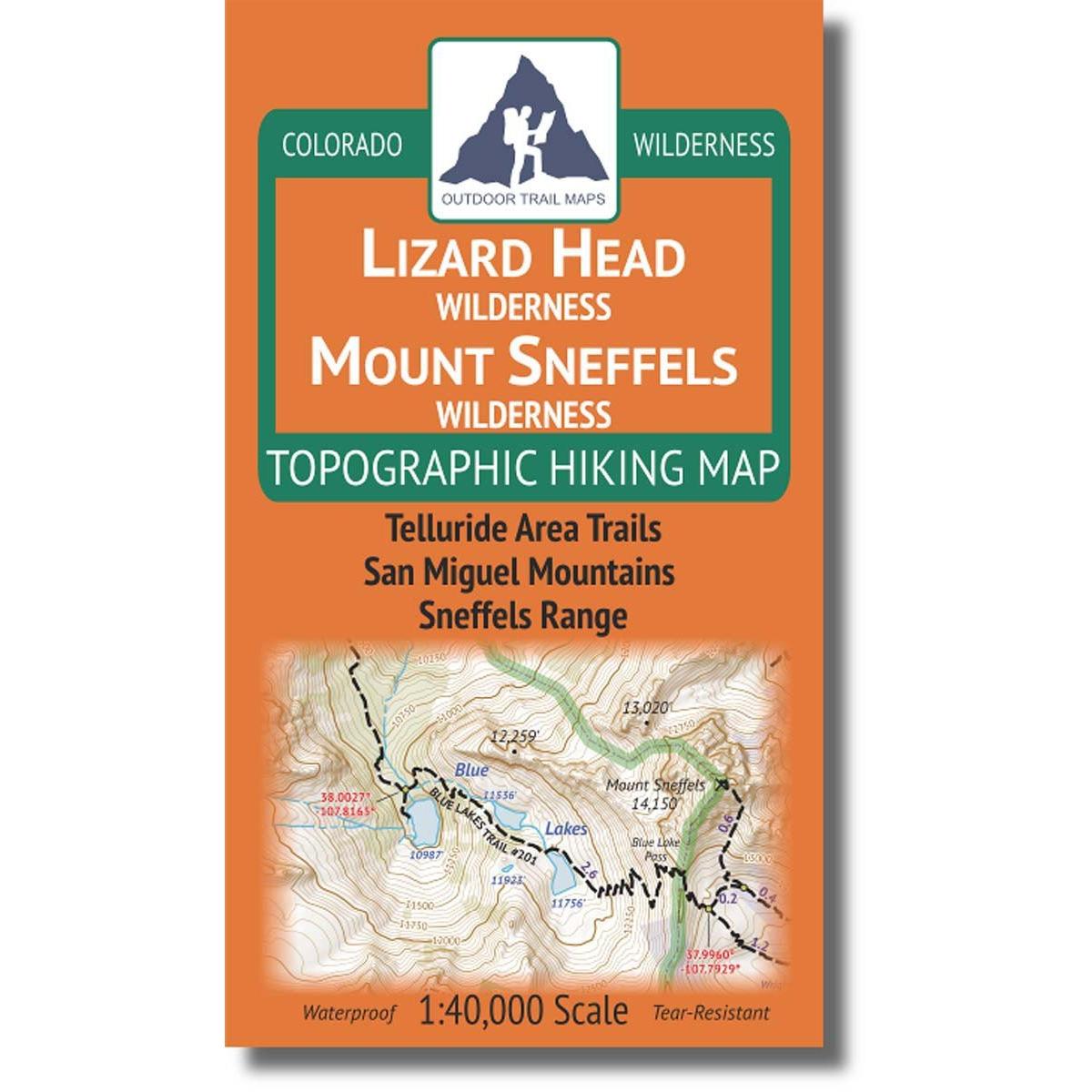 The Lizard Head / Mount Sneffels Wilderness Topographic Hiking Map shows all of the hiking trails in the Telluride Area, including all of Lizard Head and Mount Sneffels wilderness areas in the San Juan Mountains of Colorado and surroundings, with these features: