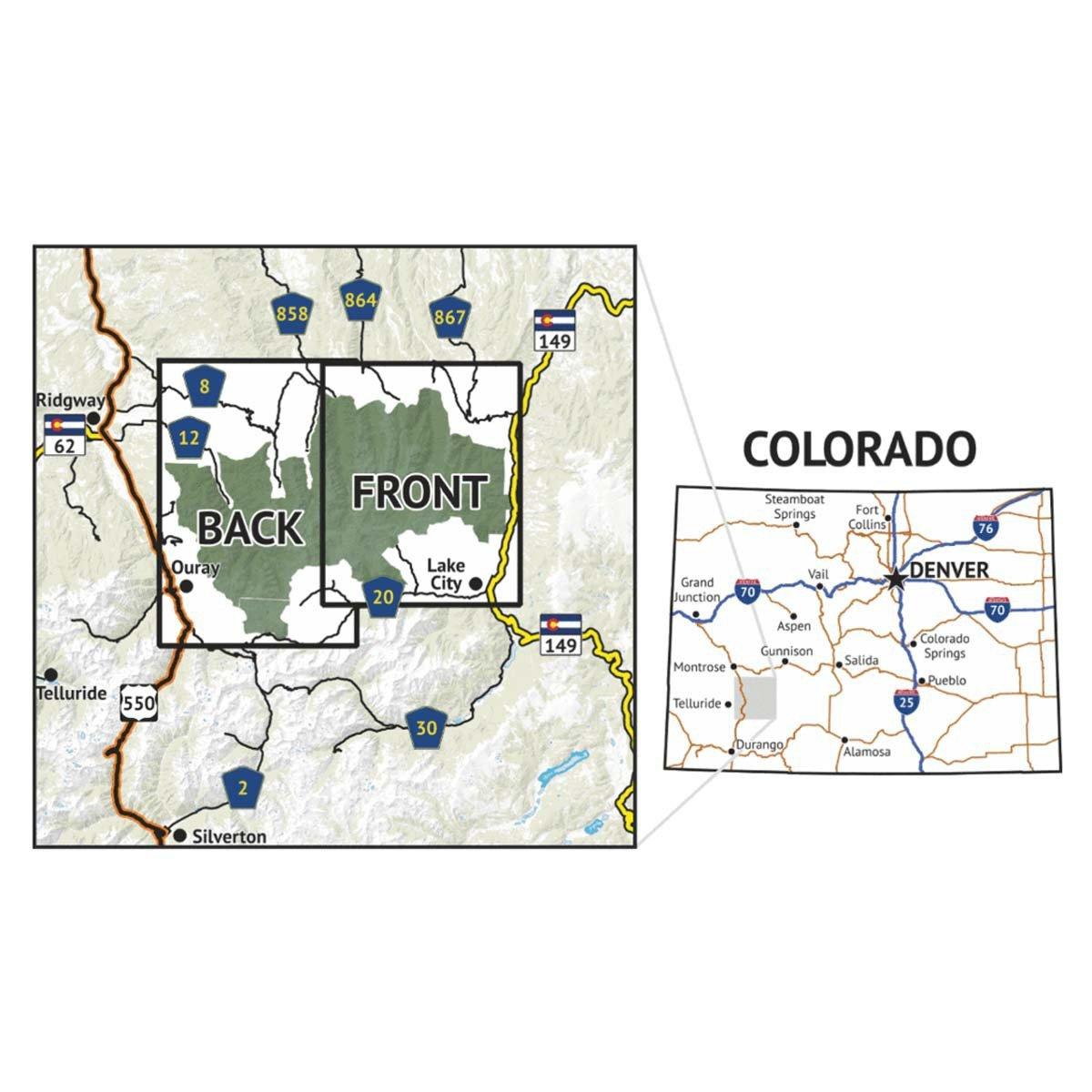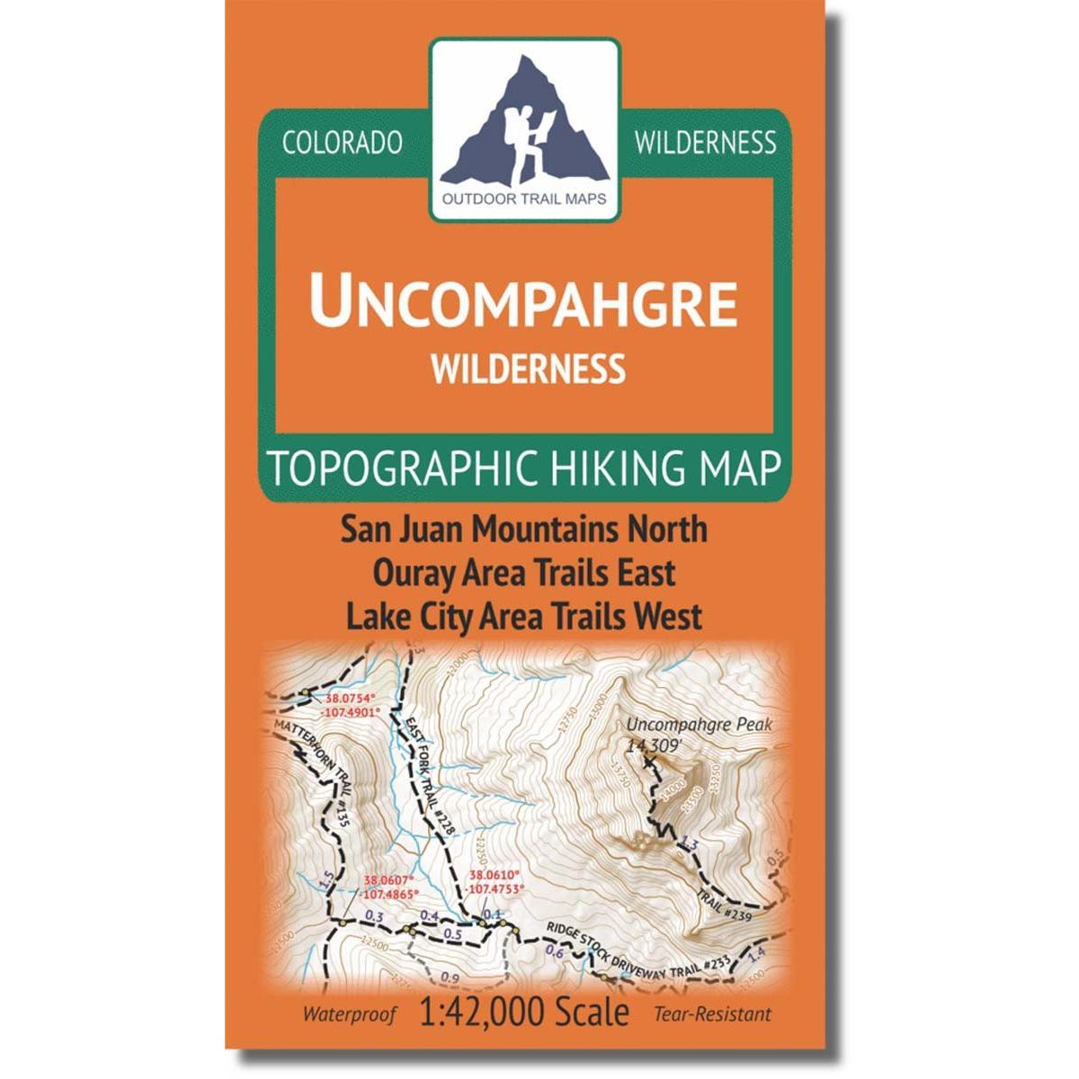 The Uncompahgre Wilderness Topographic Hiking Map shows all of the hiking trails in the Uncompahgre Wilderness in of central Colorado, with these features: