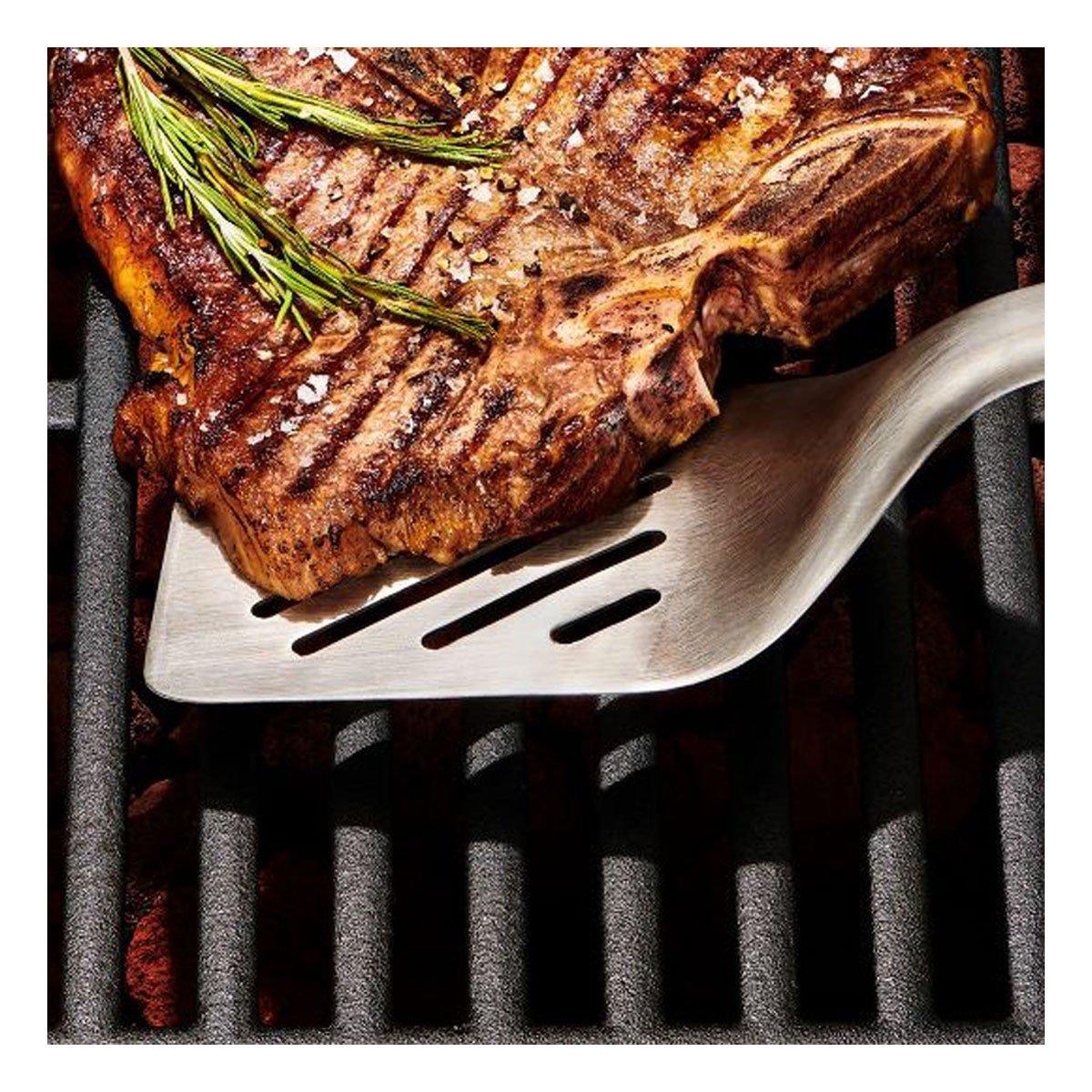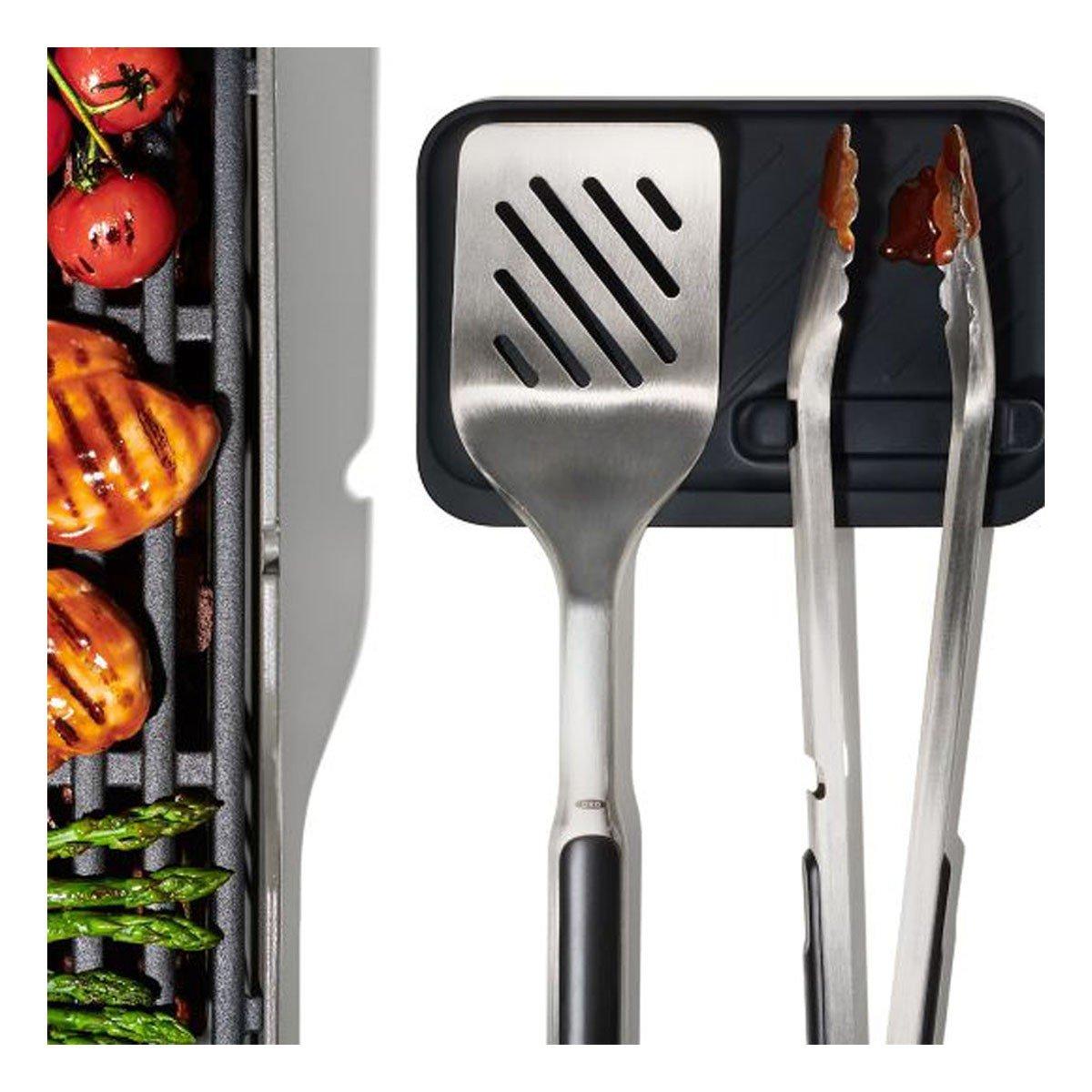 The OXO Outdoor 3-Piece Grilling Tool Set is a must-have for beginner and seasoned grillers alike. The set includes Grilling Tongs (with scalloped edges for fumble-free grabbing and a built-in bottle opener for grill-side sipping). A Grilling Turner (with a double-bend design for leverage while flipping). Finally, the Grilling Tool rest provides a neat, heat-resistant surface to rest your tools while you grill. The non-stick silicone construction and unique tong holder help with one-handed use–no more locking and unlocking tongs between turns. The tongs and turner have extra-long handles and non-slip grips for comfort and control. Dishwasher safe.
