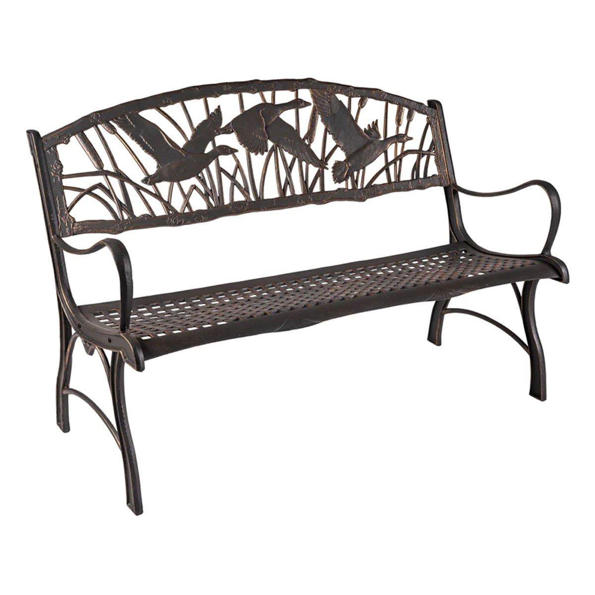 The Geese Cast Iron Garden Bench adds a touch of wildlife to your garden, deck or patio. Featuring three geese flying amid a wetland of cattails, the bench includes a bronze power coat bronze finish and hand painted gold highlights. Designed by a wildlife artist.