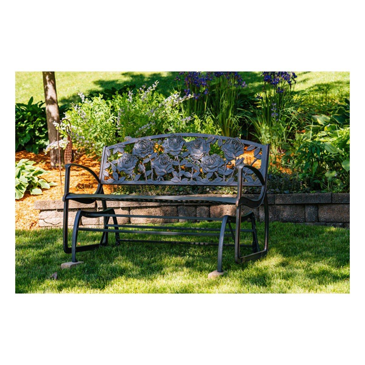 {"reviews":[],"offset":0,"limit":10,"total":0}"Full Description:\nShow some love to your garden, deck, or outdoor space with this artist-designed Rose Glider Bench (no thorns included!). The glider is ergonomically-designed to feel comfortable, while the glide is smooth and quiet. Like our other Painted Sky cast iron products, the glider features a durable powder-coat finish and hand-painted highlights.\n\nFeatures:\n\u003cul>\n\u003cli>*Rust Inhibitor\u003c/li>\n\u003cli>*Bronze Powdercoat\u003c/li>\n\u003cli>*Maintenance Free\u003c/li>\n\u003cli>*Smooth and quiet\u003c/li>\n\u003c/ul>\n\nSpecifications:\n\u003cul>\n\u003cli>Seat capacity: 800 lbs.\u003c/li>\n\u003cli>Seat height 17 1/2".\u003c/li>\n\u003cli>Product weight: 132 lbs.\u003c/li>\n\u003cli>60 1/4" wide, 32 1/2" tall, and 25" deep.\u003c/li>\n\u003c/ul>\n"